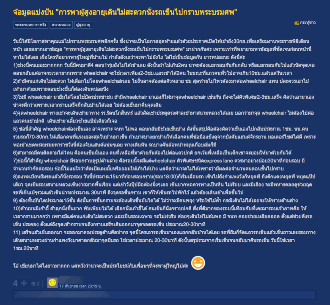 สมาชิกเว็บไซต์พันทิปรายหนึ่ง โพสต์กระทู้ที่ถือว่าเป็นการแชร์ข้อมูลดีๆ สำหรับผู้สูงอายุที่เดินไม่สะดวก ต้องนั่งวีลแชร์ โดยเจ้าของกระทู้เล่าว่า มีโอกาสพาคุณแม่ไปถวายสักการะพระบรมศพอีกครั้ง (17 ก.ย. 60) ซึ่งน่าจะเป็นโอกาสสุดท้ายแล้วด้วยประกาศเปิดให้เข้าถึง 30 ก.ย. เพื่อเตรียมงานพระราชพิธีเดือนหน้า จึงอยากแบ่งปันข้อมูล "การพาผู้สูงอายุเดินไม่สะดวกนั่งรถเข็นไปกราบพระบรมศพ" เพราะเท่าที่พยายามหาข้อมูลที่ชัดเจนก่อนหน้านี้หาไม่ได้เลย เผื่อใครที่อยากพาผู้ใหญ่ที่บ้านไป กำลังลังเลว่าจะพาไปยังไง ได้ใช้เป็นข้อมูลกัน