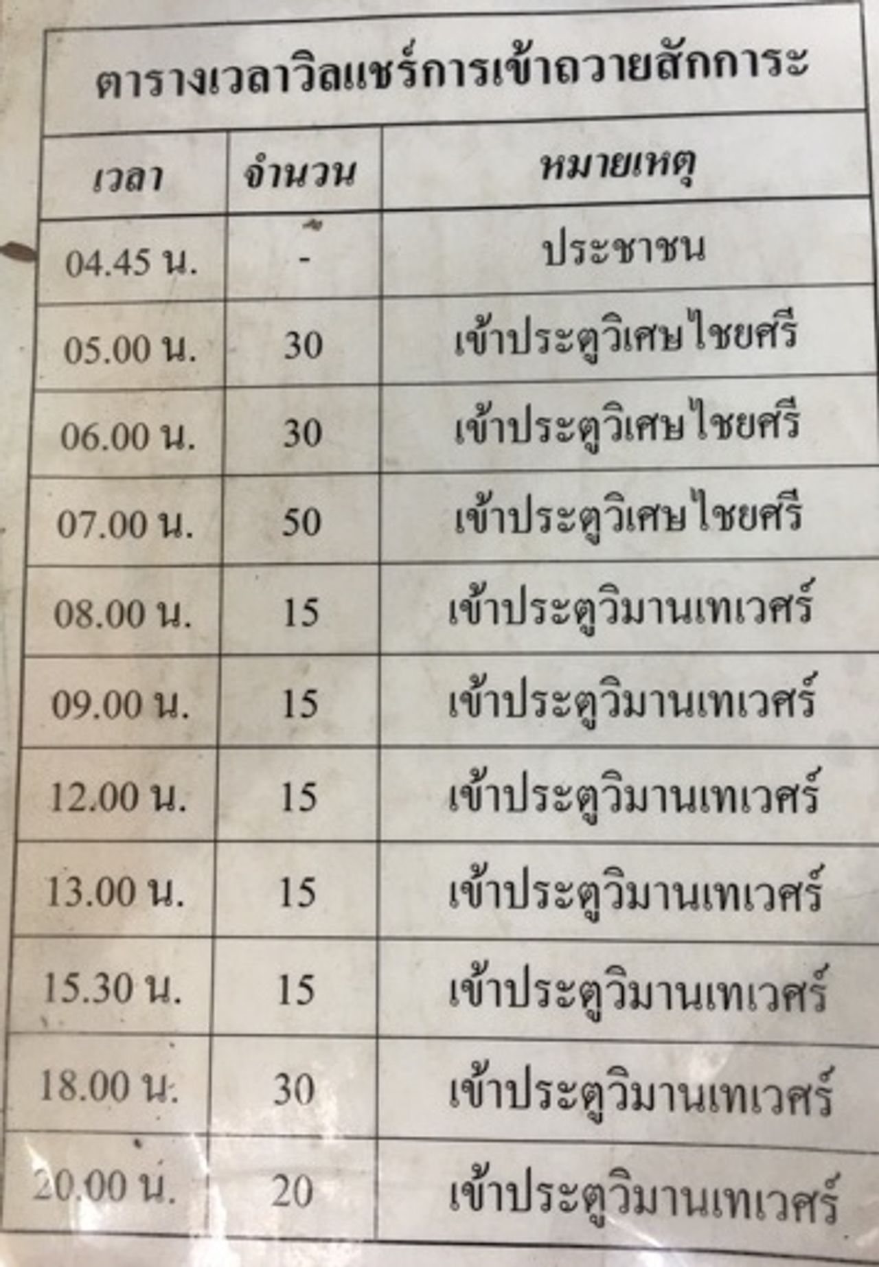 ถ้ามีคนแก่เดินไม่สะดวกให้เลือกไปโดยวีลแชร์ เข้าได้ 2 คน ใช้เวลาเพียง 2-3 ชั่วโมง ในขณะที่แถวคนทั่วไปอาจเกิน 10 ชั่วโมง (แล้วแต่วัน-เวลา) แต่สุดท้ายอาจจะยืนไม่ไหวต้องมาต่อวีลแชร์แทน และควรนำไม้เท้ามาด้วยเพราะตอนช่วงขึ้นก็ต้องเดิน ส่วนการยืมวีลแชร์ทำได้โดยใช้บัตรประชาชน หากมีวีลแชร์มาเองก็ให้มาจุดวีลแชร์เช่นกัน จึงจะได้คิวพิเศษ 2-3 ชั่วโมงเสร็จ