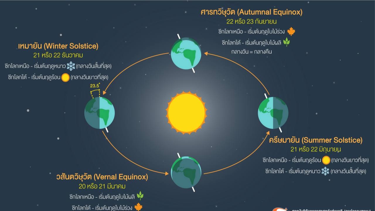 สำหรับ ประเทศไทยวันนี้ ดวงอาทิตย์ขึ้นจากขอบฟ้าทางทิศตะวันออก เวลาประมาณ 06.07 น. และตกลับขอบฟ้าทางทิศตะวันตก เวลาประมาณ 08.13 น. หลังจากวันดังกล่าว ดวงอาทิตย์จะเคลื่อนลงทางใต้เรื่อยๆ และหยุดที่จุดใต้สุด ในวันที่ 21 ธ.ค.2560 จากนั้นจะเคลื่อนขึ้นทางเหนืออีกครั้งหนึ่ง ซึ่งในหนึ่งปีจะมีวันที่ดวงอาทิตย์ขึ้นทางทิศตะวันออกและตกทางทิศตะวันตกพอดีเพียง 2 ครั้งเท่านั้น คือ วันวสันตวิษุวัต (Vernal Equinox) ประมาณวันที่ 20 หรือ 21 มี.ค. และ วันศารทวิษุวัต (Autumnal Equinox) วันที่ 22 หรือ 23 ก.ย.ทำให้เป็นวันที่มีเวลากลางวันและกลางคืนยาวเท่ากัน