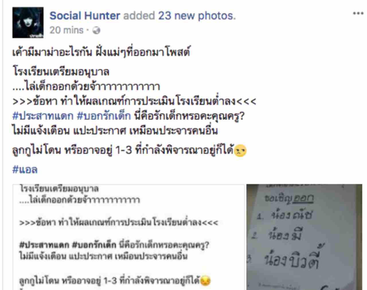 แฟนเพจแหม่มโพธิ์ดำ โพสต์ข้อความระบุว่า "เคสนี้น่าสนใจ เด็กๆ อนุบาลป่วยเพราะเป็นหวัดเลยไม่ได้ไปโรงเรียน ผลคือ ครูให้ออกด้วยการแปะป้ายประจานหน้าห้อง เพราะเด็กไม่มีคุณภาพทำให้การประเมินผลแย่ลง แบบนี้ก็ได้เหรอ?"