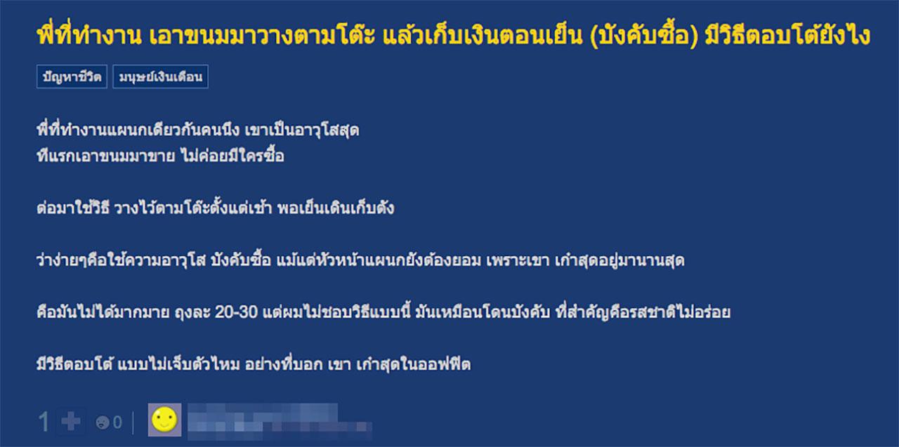 พนักงานออฟฟิศหลายคนเคยเจอเหตุการณ์กันแปลกๆ จนบางทีก็คิดว่า แบบนี้ก็มีด้วย ล่าสุด สมาชิกพันทิปรายหนึ่งตั้งกระทู้ถามเพื่อนสมาชิกว่า “พี่ที่ทำงาน เอาขนมมาวางตามโต๊ะ แล้วเก็บเงินตอนเย็น (บังคับซื้อ) มีวิธีตอบโต้อย่างไร” พร้อมโพสต์อธิบายว่า พี่ที่ทำงานแผนกเดียวกันคนหนึ่งเป็นอาวุโสสุด ทีแรกเอาขนมมาขาย ไม่ค่อยมีใครซื้อ ต่อมาใช้วิธีวางไว้ตามโต๊ะตั้งแต่เช้า พอเย็นเดินเก็บตังค์ ว่าง่ายๆ คือใช้ความอาวุโสบังคับซื้อ แม้แต่หัวหน้าแผนกยังต้องยอม เพราะเขาเก๋าสุด อยู่มานานสุด คือมันไม่ได้มากมาย ถุงละ 20-30 บาท แต่ผมไม่ชอบวิธีแบบนี้ มันเหมือนโดนบังคับ ที่สำคัญคือรสชาติไม่อร่อย มีวิธีตอบโต้แบบไม่เจ็บตัวไหม