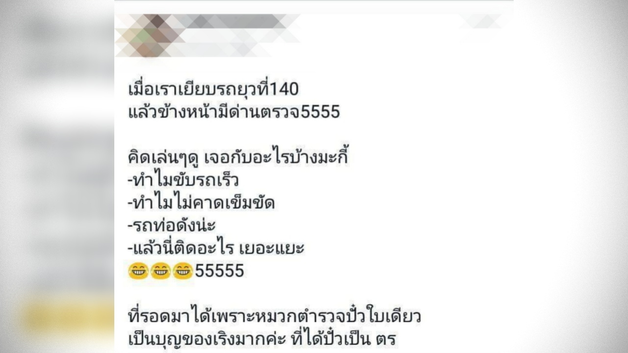 เพจเฟซบุ๊ก ควาย+Social V.3 มีการโพสต์ภาพของหญิงรายหนึ่ง ซึ่งเจ้าตัวโพสต์แคปชั่นบนเฟซบุ๊กส่วนตัวทำนองว่า ขับรถเหยียบคันเร่งที่ความเร็วที่ 140 กม./ชม. แต่กลับไม่ถูกตำรวจจับ พร้อมทิ้งท้ายว่า “รอดมาได้เพราะหมวกตำรวจของปั๋วใบเดียว เป็นบุญของเริงมากค่ะ ที่ได้ปั๋วเป็น ตร.”