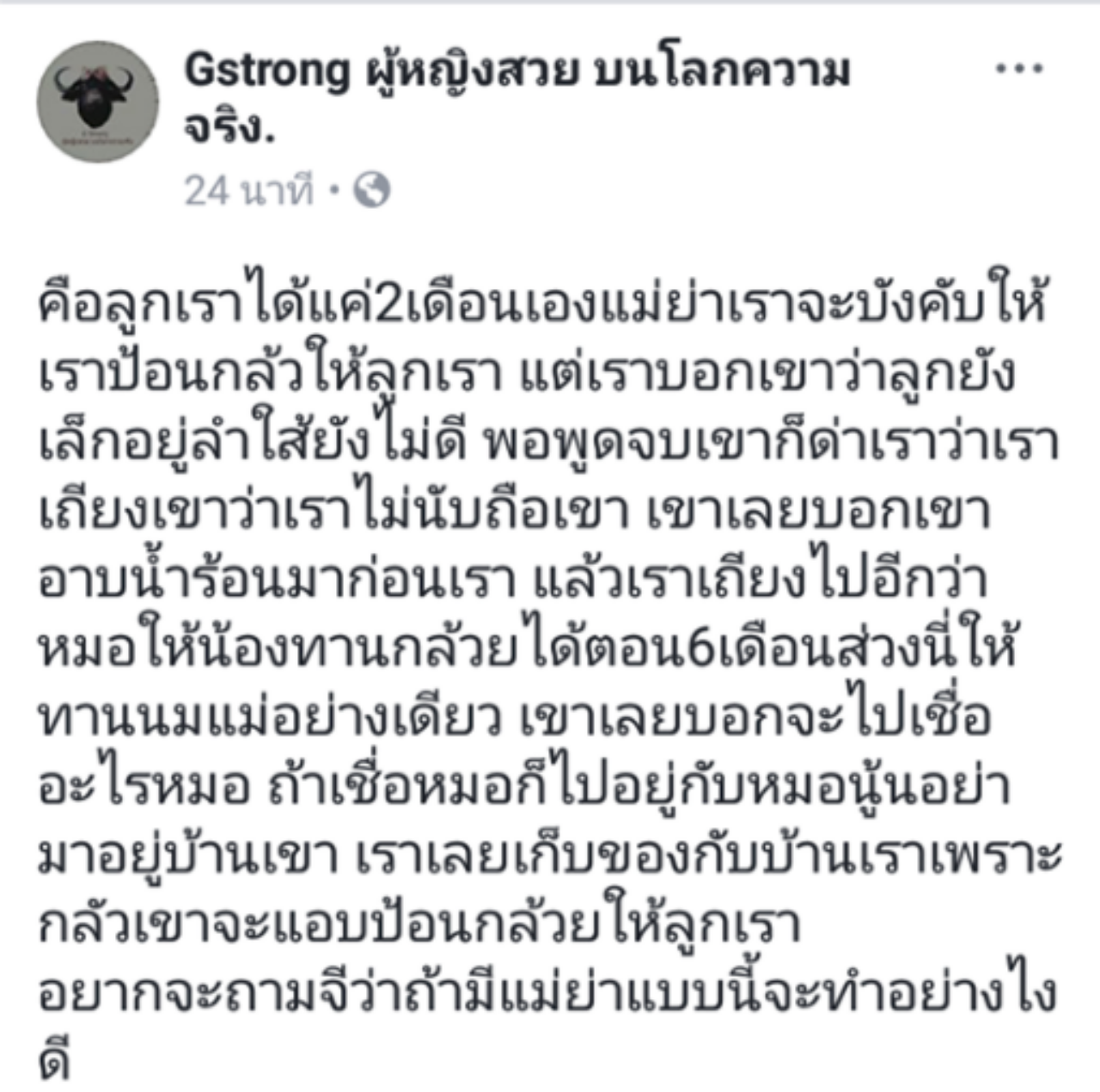 เชื่อว่าคุณแม่ และคนที่ไม่ใช่คุณแม่ทั้งหลายแหล่ คงเคยได้เห็นและได้ยินมาเสมอ เรื่องการป้อนกล้วยบดเด็กเล็กอายุไม่ถึง 6 เดือน เพราะผู้ใหญ่มักจะบอกว่าเคยกระทำมาก่อน ล่าสุด เฟซบุ๊ก Drama-addict มีการโพสต์ภาพจากเฟซบุ๊ก Gstrong ผู้หญิงสวย บนโลกความจริง. โดยมีข้อความว่า “คุณแม่มีลูกอายุ 2 เดือน แต่แม่สามีจะบังคับให้ป้อนกล้วยบด จึงแย้งไปว่าลูกยังเล็กลำไส้ยังไม่ดี ก็ถูกแม่สามีต่อว่า ว่าไม่นับถือ ทำนองว่าเขาอาบน้ำร้อนมาก่อน คุณแม่รายนี้จึงโต้ตอบกลับไปว่าหมอให้ทานได้ตอน 6 เดือน ช่วงนี้ต้องทานนมแม่อย่างเดียว แม่สามีกลับบอกว่าจะไปเชื่ออะไรหมอ ถ้าเชื่อหมอก้ไปอยู่กับหมอ อย่ามาอยู่บ้านเขา คุณแม่คนนี้จึงเก็บของกลับบ้านเพราะกลัวแม่สามีจะแอบป้อนกล้วยบด”