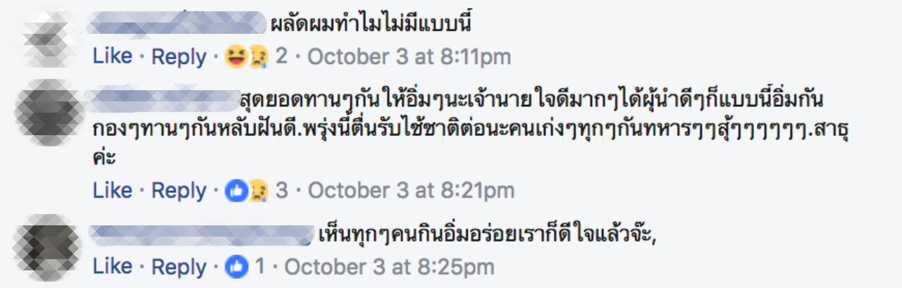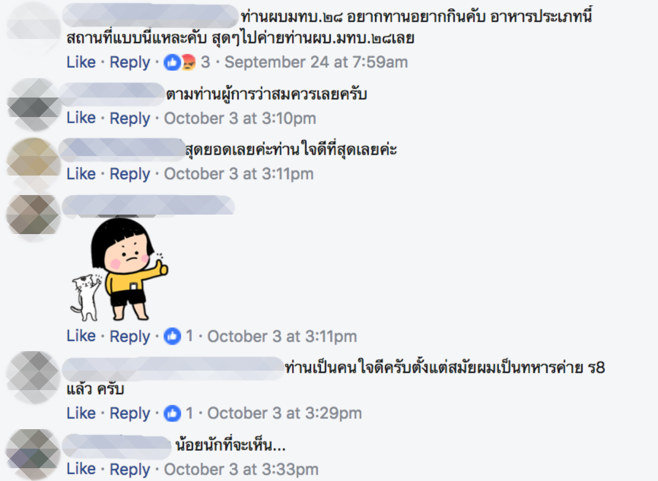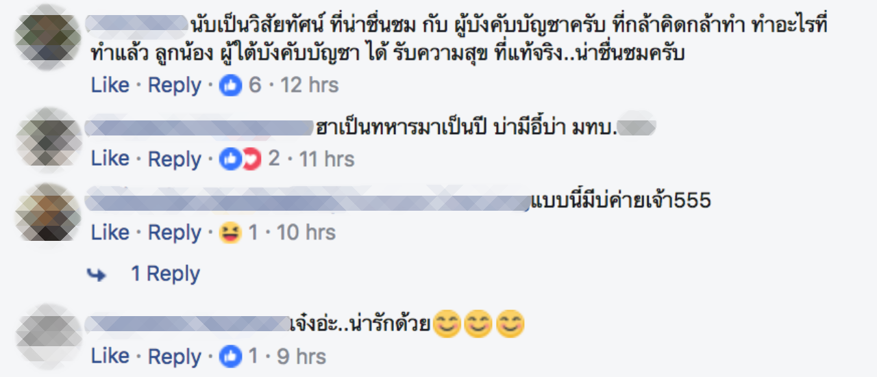 ซึ่งภาพชุดนี้ มีผู้แชร์ออกไปเกือบพันครั้ง ช่างเป็นภาพที่น่าประทับใจ ด้านชาวเน็ตได้เข้ามาแสดงความคิดเห็นกันว่า เป็นเรื่องดีที่ผู้บังคับบัญชาดูแลทหารผู้น้อยเช่นนี้ ทำให้ได้กินอิ่มและมีความสุขกัน บ้างก็บอกว่าอยากให้ค่ายอื่นๆ มีเช่นนี้บ้าง...
