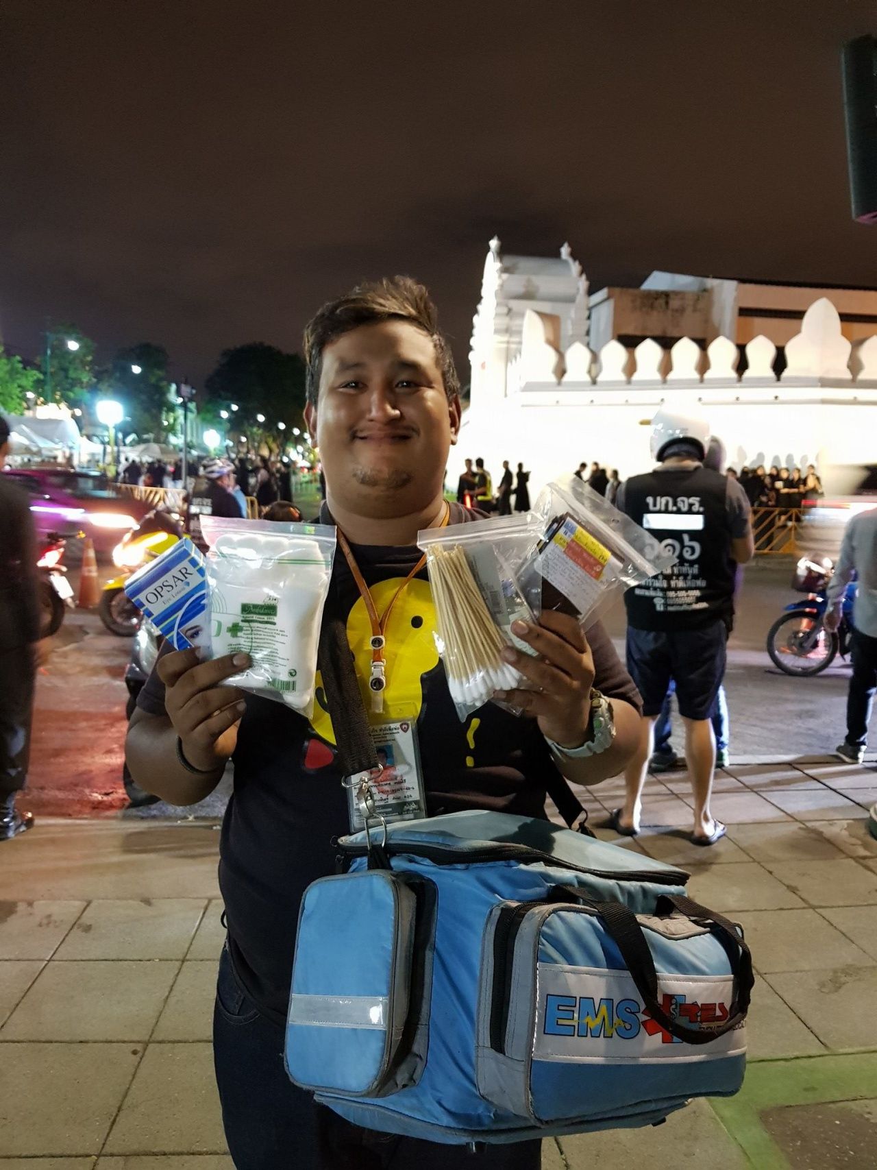 นอกจากนี้ เฟซบุ๊ก มอเตอร์ไซค์จิตอาสา ได้มีการโพสต์ขอบคุณไปยังผู้ใช้เฟซบุ๊ก Pakorn Chernphimai ที่มีการเชิญชวนคนมาร่วมสมทบทุนซื้อยาและเวชภัณฑ์ สำหรับส่งมอบให้อาสาสมัครกลุ่มต่างๆ เพื่อใช้ในการปฐมพยาบาลช่วยเหลือประชาชนช่วงพระราชพิธีถวายพระเพลิงพระบรมศพ ด้วย ไม่เพียงแค่ยา แต่ยังมีกลุ่มคนหลายกลุ่มที่มักนำขนมหรืออาหารมาให้เพื่อสนับสนุนเหล่าจิตอาสาที่เสียสละมาให้บริการประชาชนด้วย