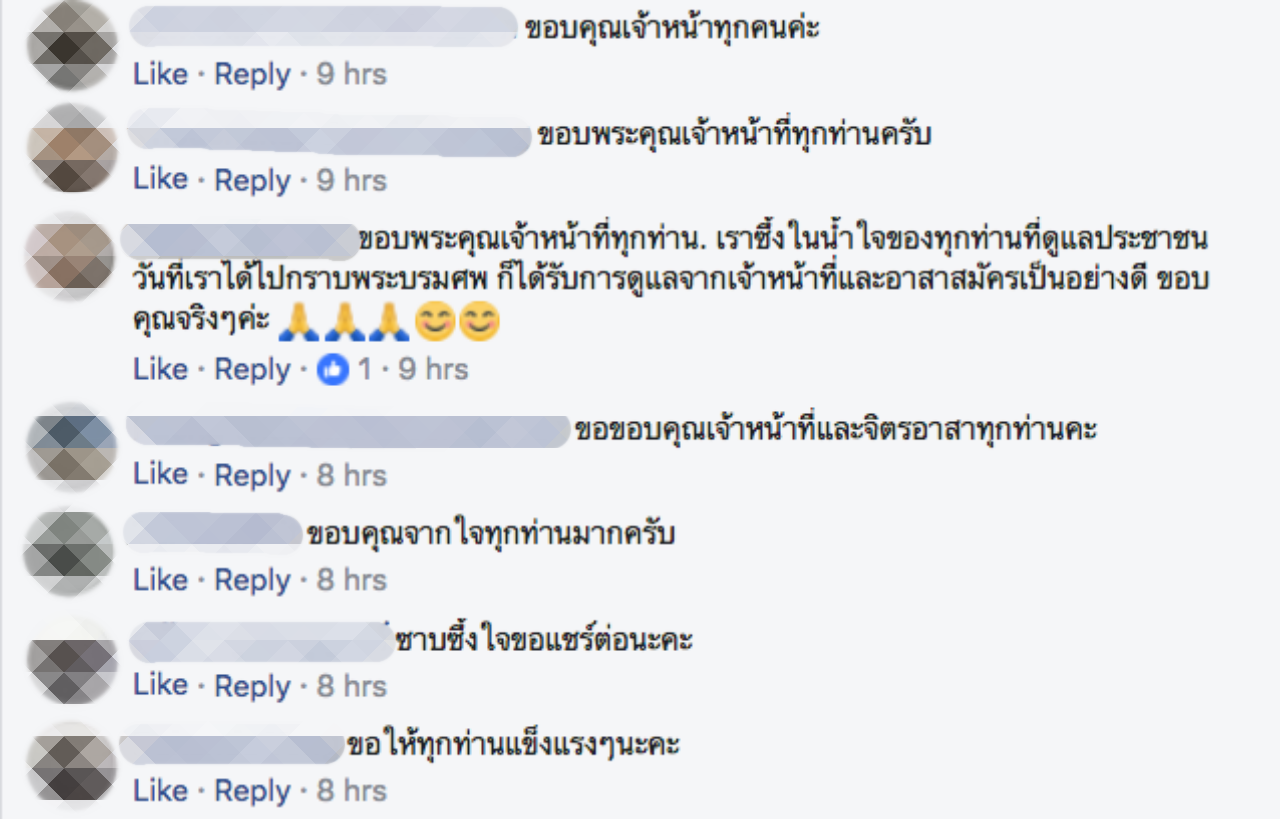 ซึ่งภาพและเรื่องราวเล่านี้ ทำให้ผู้ที่เข้ามาพบเห็นต่างประทับใจและชื่นชมในการตั้งใจปฏิบัติหน้าที่อย่างไม่ย่อท้อแม้ร่างกายจะอ่อนล้า และขอบคุณเจ้าหน้าที่คนดังกล่าว เจ้าหน้าที่ทุกคน และอาสาสมัครทั้งหมดที่ทำหน้าที่ด้วยความจงรักภักดีเพื่อถวายพ่อหลวงของเรา.