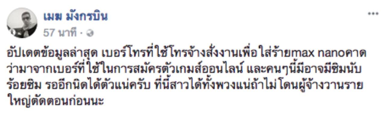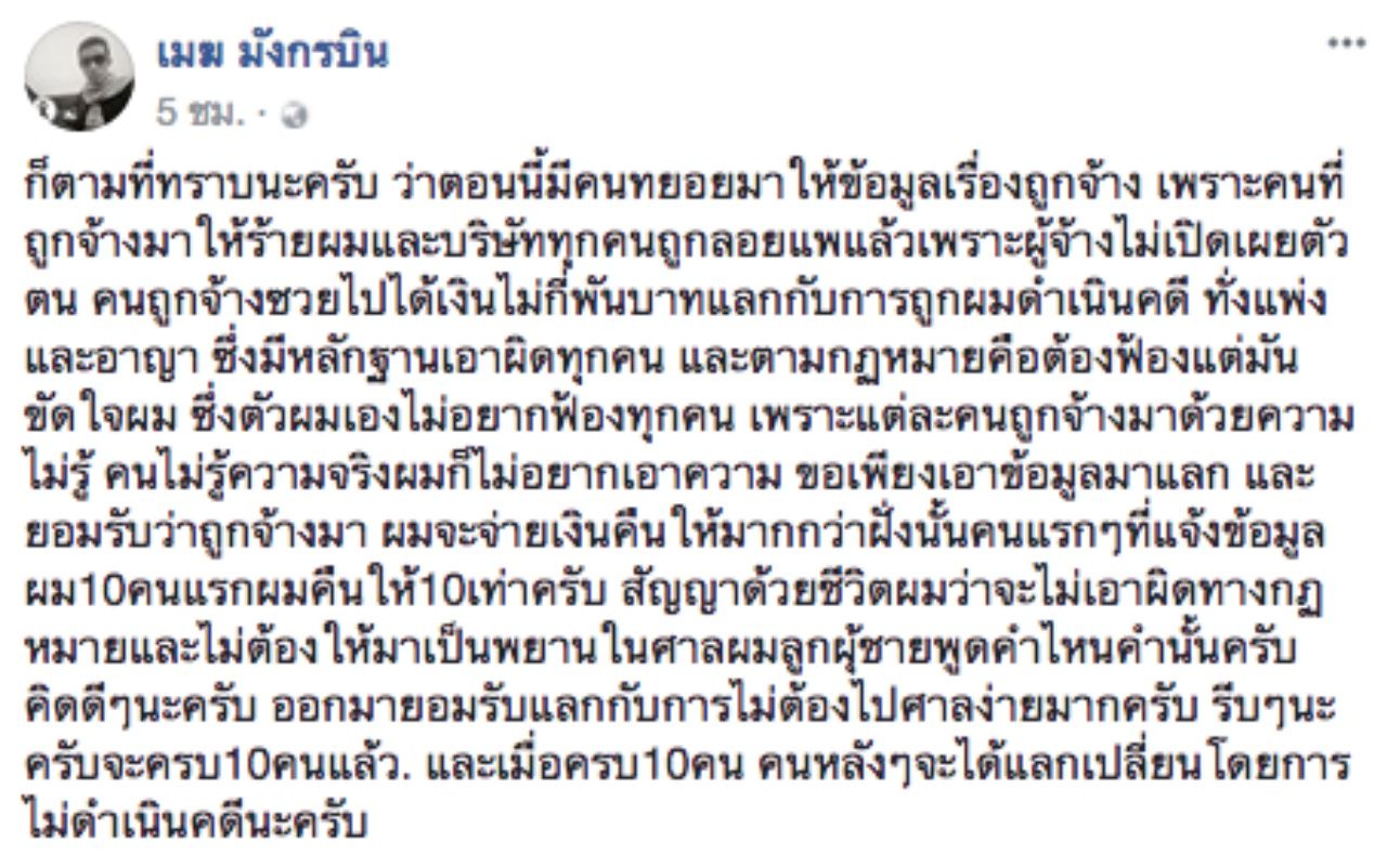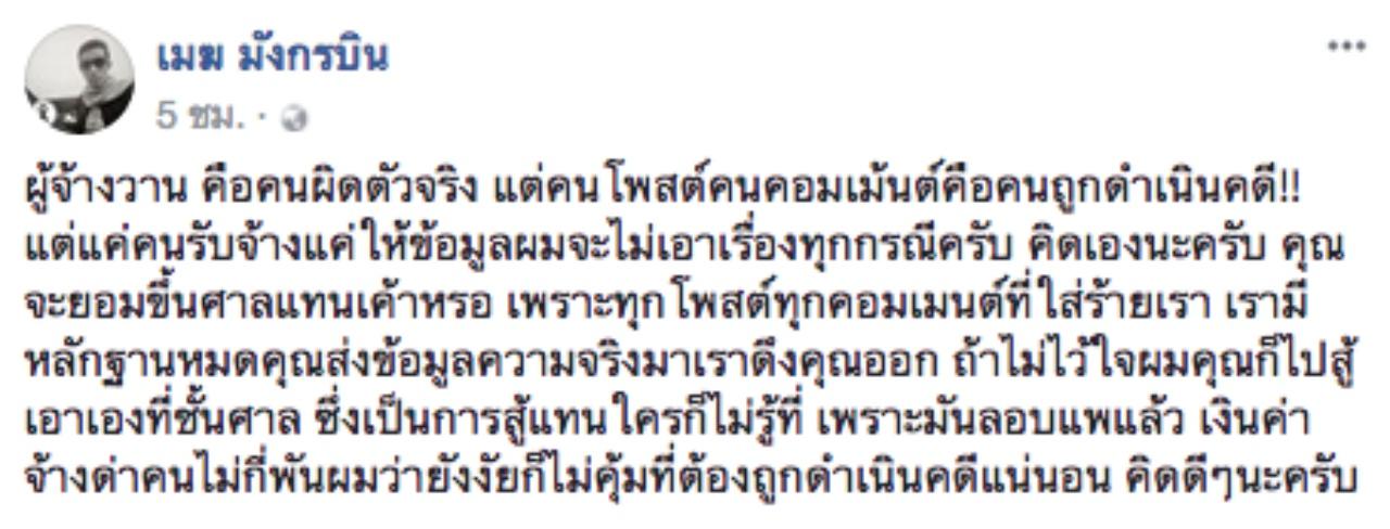พร้อมกับระบุว่า "ผู้จ้างวาน คือ คนผิดตัวจริง แต่คนโพสต์คนคอมเมนต์ คือ คนถูกดำเนินคดี!! แต่แค่คนรับจ้างแค่ให้ข้อมูลผมจะไม่เอาเรื่องทุกกรณีครับ คิดเองนะครับ คุณจะยอมขึ้นศาลแทนเค้าหรอ"