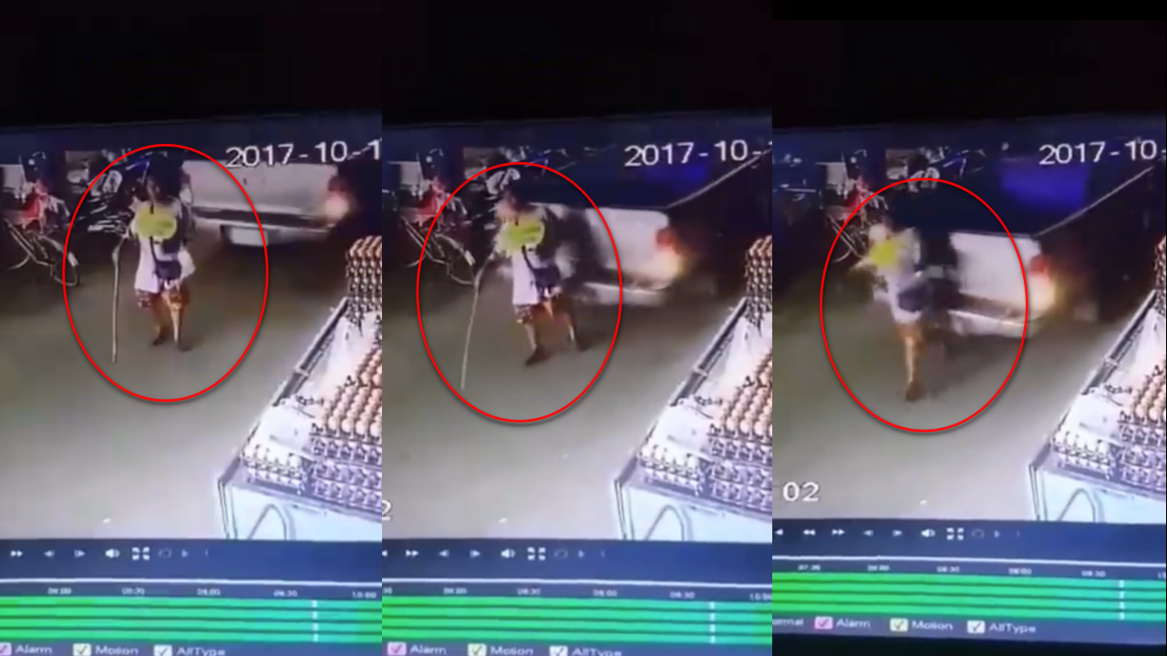 หญิงป่วยใช้ไม้เท้าช่วยพยุงเดินอยู่ในตลาดเสาธงปืนใหญ่ ถูกรถกระบะถอยชนอย่างจังจนกระเด็น แต่โชคดีไม่ล้ม ก่อนรถกระบะจะถอยต่อไปเหมือนไม่มีอะไรเกิดขึ้น