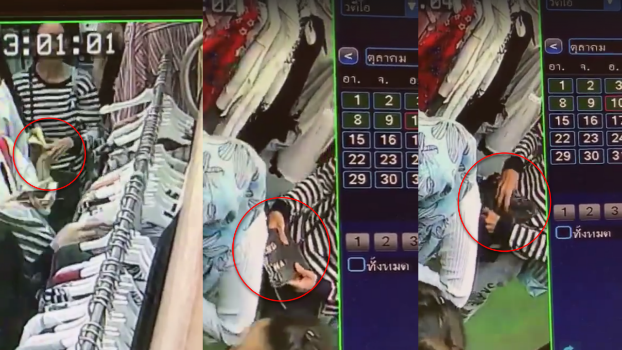 เจ้าของร้านเสื้อผ้าเปิดเผยกล้องวงจรปิด หลังถูกหญิงเสื้อลายทางขาว-ดำขโมยเสื้อยัดใส่กระเป๋าอย่างแนบเนียนช่วงที่ลูกค้าเต็มร้าน