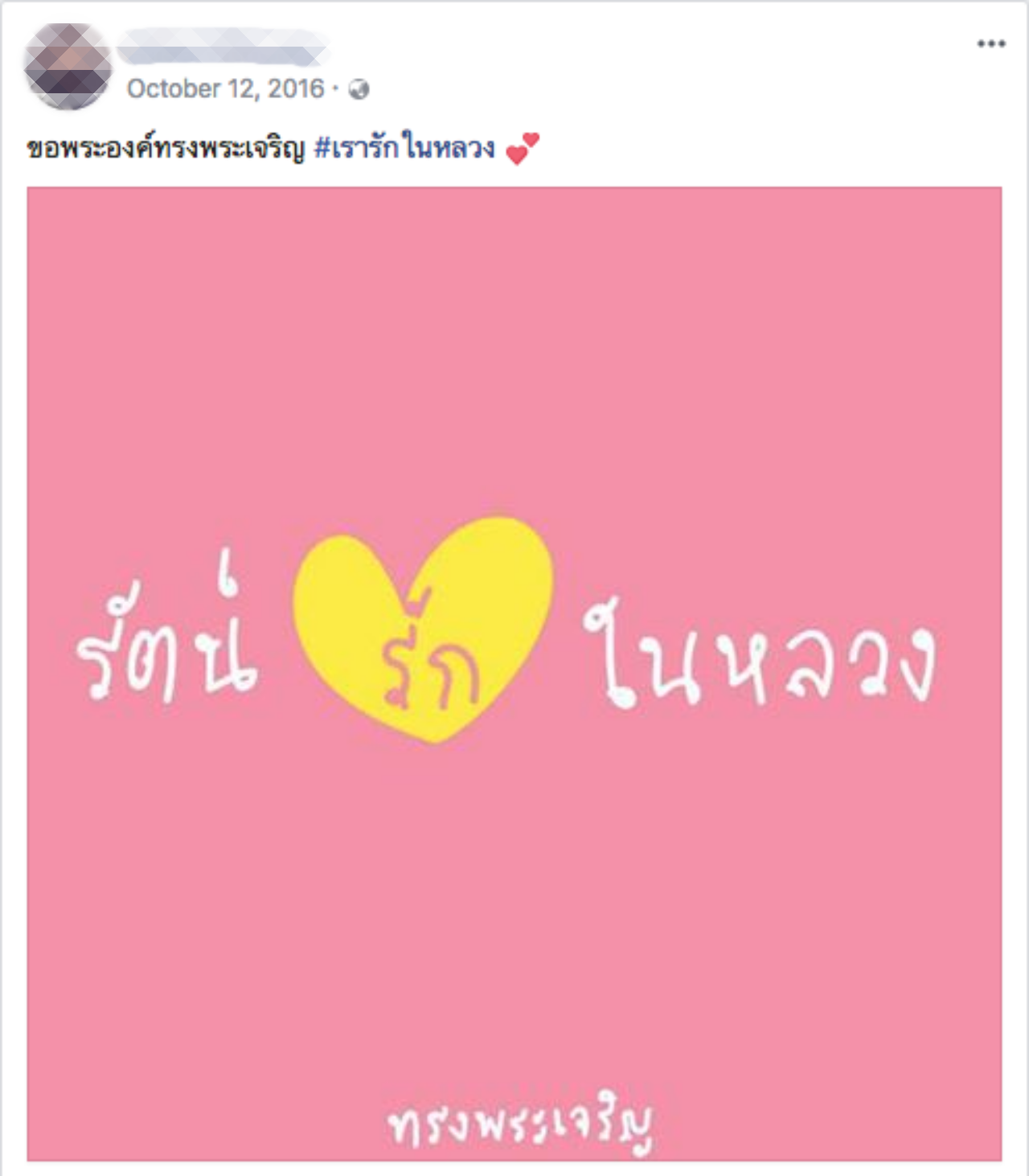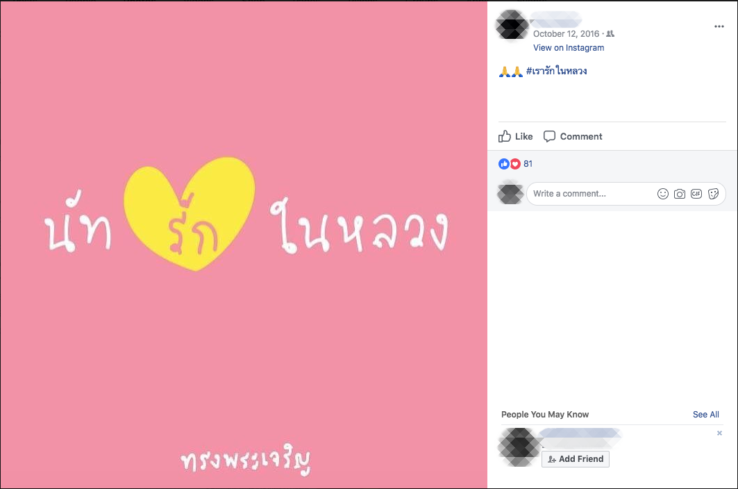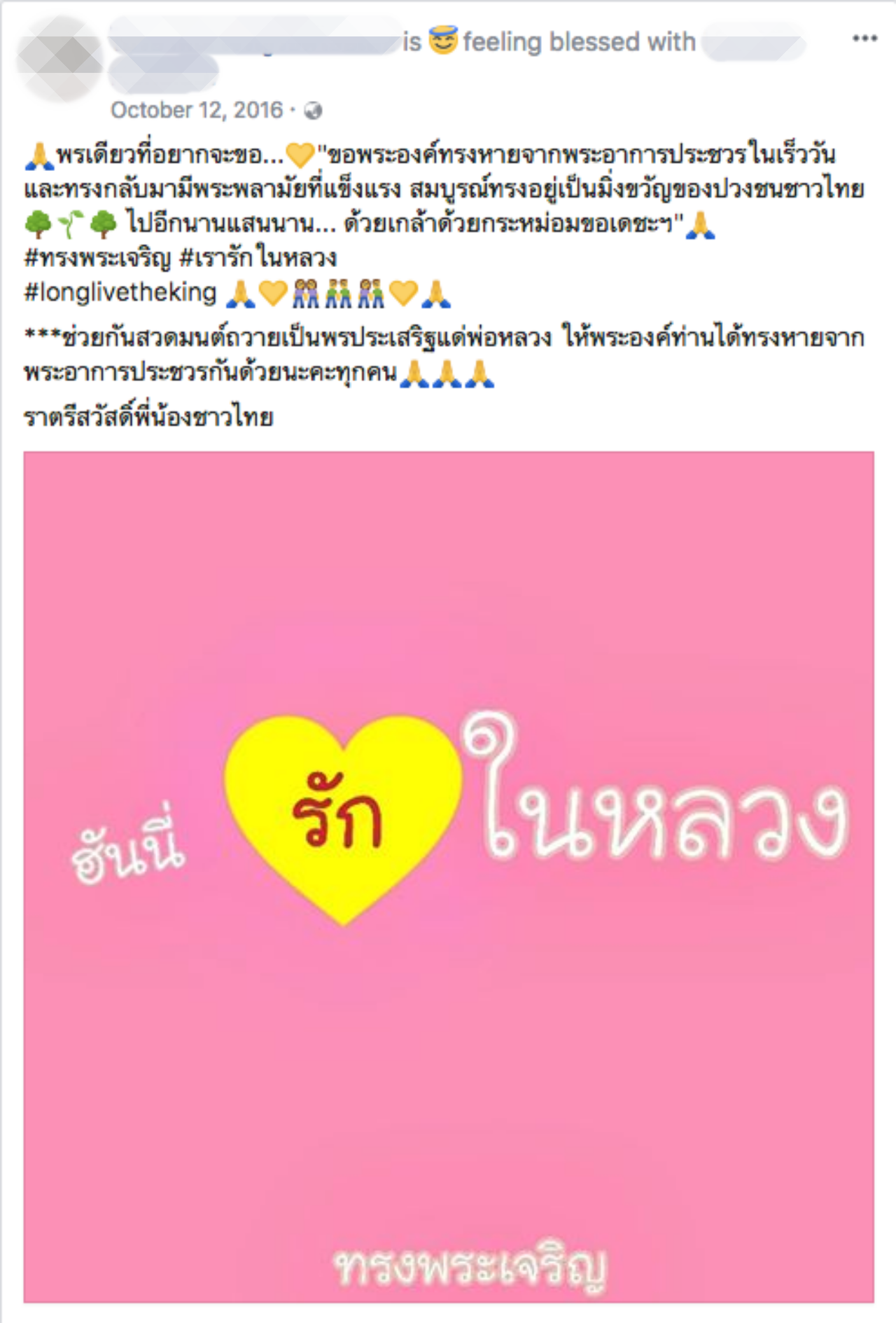 ยังจำกันได้หรือไม่... ในห้วงเวลานี้เมื่อ 1 ปีก่อน ประชาชนจำนวนมากต่างเปลี่ยนโปรไฟล์เฟซบุ๊กรูปที่มีพื้นหลังเป็นสีชมพู มีชื่อของเรา หัวใจสีเหลืองที่มีคำว่า "รัก" อยู่ข้างใน และต่อด้วย "ในหลวง" เพื่อเป็นการแสดงความรักอย่างพร้อมเพรียงอีกทางหนึ่งต่อ พระบาทสมเด็จพระปรมินทรมหาภูมิพลอดุลยเดช บรมนาถบพิตร รวมถึงการใช้แฮชแท็ก #เรารักในหลวง #ทรงพระเจริญ ทั้งในทวิตเตอร์ รวมถึงอินสตาแกรม ซึ่งในช่วงนี้เฟซบุ๊กก็จะมีการแจ้งเตือนความทรงจำที่เราเคยได้ทำ ซึ่งเป็นความทรงจำที่ใครๆ ก็ไม่อยากลืมเลือน
