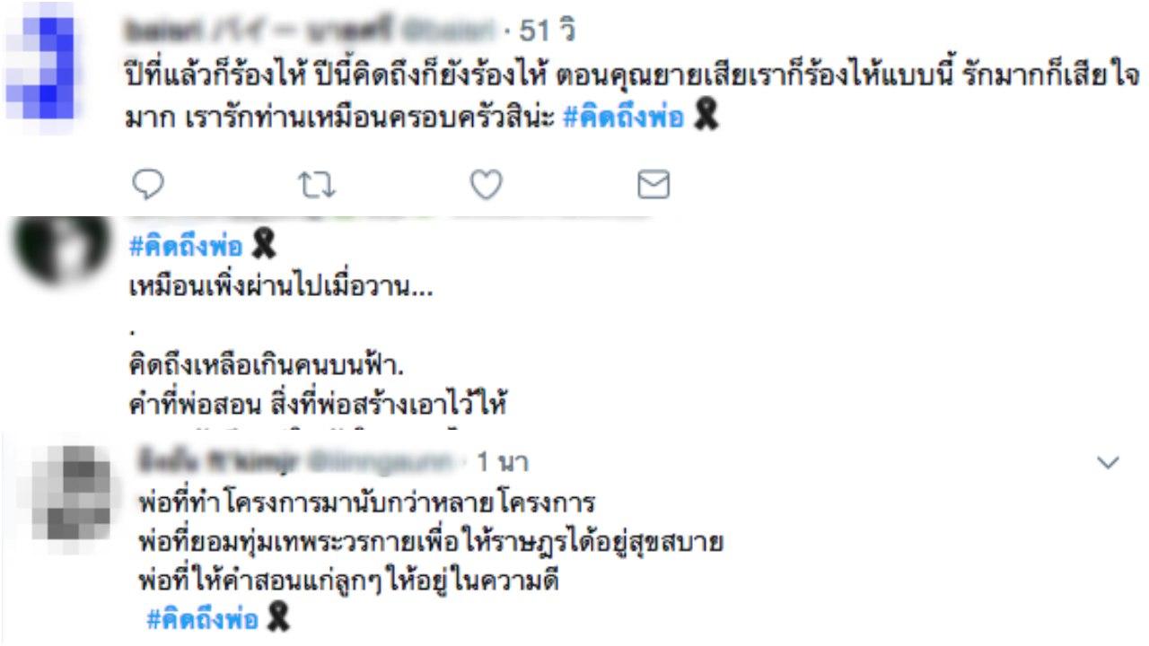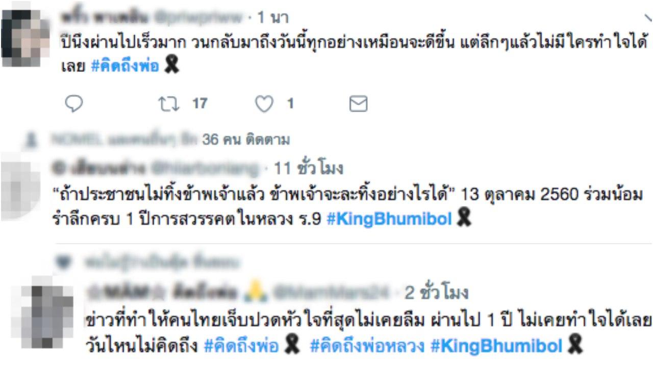 โดยจะเห็นได้จากการติดแฮชแท็กเพื่อแสดงความอาลัย ในโลกออนไลน์ อาทิ #คิดถึงพ่อ #รักในหลวง #ทรงพระเจริญ #KingRama9 #KingBhumibol #ส่งใจสู่ฟ้าอาลัยพ่อ #365วันที่พ่อจากไป และ #ธสถิตในดวงใจไทยนิรันดร์ พร้อมกับความรู้สึกต่างๆ ที่ประชาชนมีต่อพ่อหลวง โดยส่วนใหญ่ระบุว่า พระองค์ทรงเป็นแบบอย่างของการทำความดีในทุกๆ ด้าน และพระองค์จะอยู่ในหัวใจของคนไทยตลอดไป...