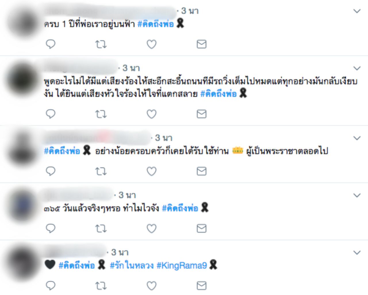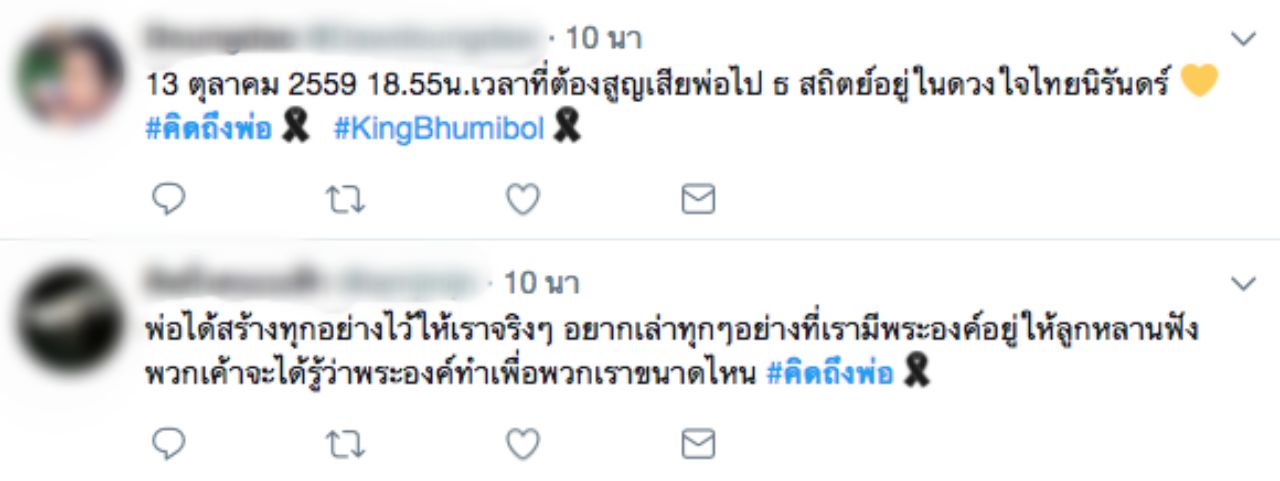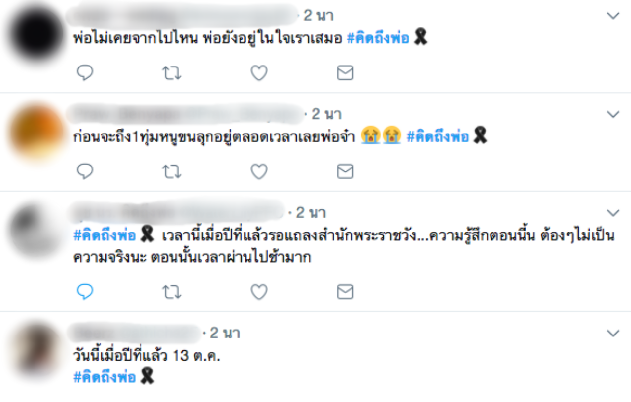 ทั้งนี้ยังพบว่าในโลกออนไลน์ต่างโพสต์ข้อความแสดงความอาลัยเพื่อรำลึกถึงในหลวง ร.9 กันจำนวนมาก โดยระบุว่า “พ่อไม่เคยจากไปไหน พ่อยังอยู่ในใจเราเสมอ" "#คิดถึงพ่อ เวลานี้เมื่อปีที่แล้วรอแถลงสำนักพระราชวัง...ความรู้สึกตอนนั้น ต้องไม่เป็นความจริงนะ ตอนนั้นเวลาผ่านไปช้ามาก" เป็นต้น