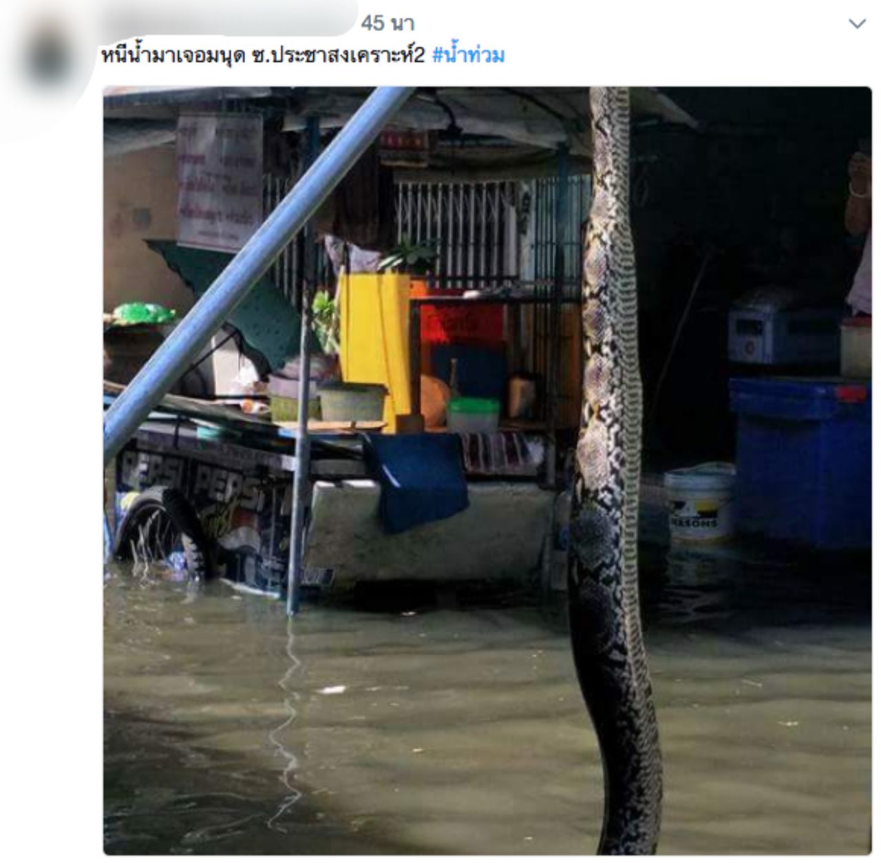 โลกออนไลน์ขนลุกซู่! รวมภาพสัตว์เลื้อยคลานโผล่หนีน้ำท่วมกรุงเทพฯ งูเหลือม ตัวเงินตัวทอง หนู แมลงสาบ มากันครบทีม