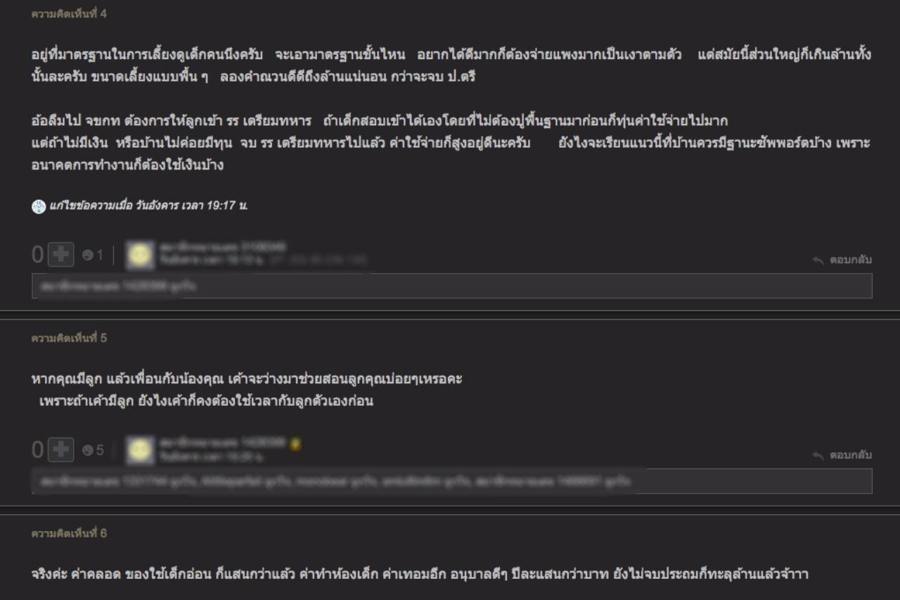 ทั้งนี้ได้มีชาวเน็ตเข้ามาแสดงความคิดเห็นหลากหลาย โดยบางส่วนโต้แย้งว่า หากลูกของเจ้าของกระทู้เป็นผู้หญิง หรือหากเด็กไม่ต้องการเป็นทหาร จะทำอย่างไร ประกอบกับค่าใช้จ่ายตั้งแต่แรกเกิด อาทิ ค่าใช้จ่ายทำคลอด ค่าผ้าอ้อม นมผง เสื้อผ้า ค่าฉีดวัคซีน ค่าขนม ของเล่น และรักษาพยาบาล ซึ่งกว่าเด็กจะโตจนสามารถทำงานได้ก็น่าจะถึง 1 ล้านบาท ขณะที่บางรายมองว่า หากเป็นเด็กต่างจังหวัดก็อาจจะใช้เงินไม่ถึงก็เป็นได้ ซึ่งอยู่กับการเลี้ยงดูของแต่ละครอบครัว
