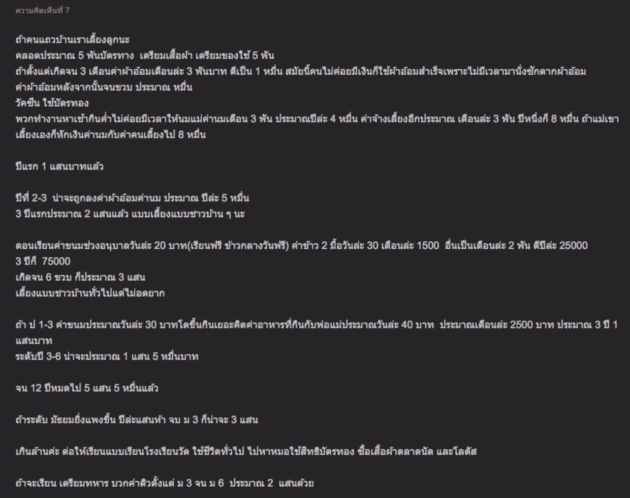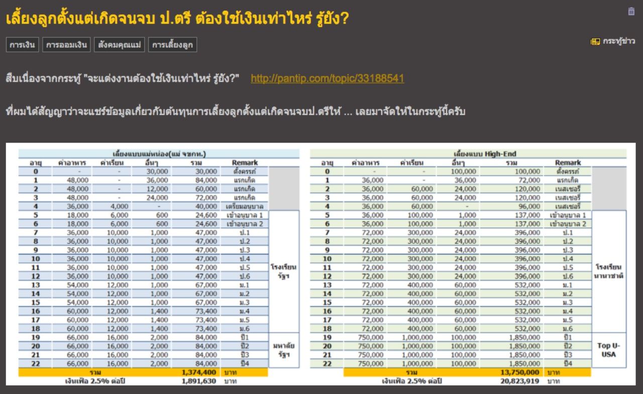 อย่างไรก็ตามพบว่าที่ผ่านมามีคนตั้งกระทู้คำนวณค่าใช้จ่ายในการเลี้ยงเด็กตั้งแต่เกิดจนถึงอายุ 22 ปี แบบละเอียดมาให้พ่อแม่มือใหม่ได้คำนวณค่าใช้จ่ายกันบ้างแล้ว พร้อมกับรวมค่าเงินเฟ้อ 2.5% ต่อปี โดยแบ่งเป็นการเลี้ยงลูกแบบธรรมดา เรียนโรงเรียนและมหาวิทยาลัยรัฐบาล จะใช้เงินประมาณ 1,891,630 บาท ขณะที่เลี้ยงลูกแบบเรียนโรงเรียนนานาชาติจะมีค่าใช้จ่ายกว่า 2 ล้านบาท เป็นต้น
