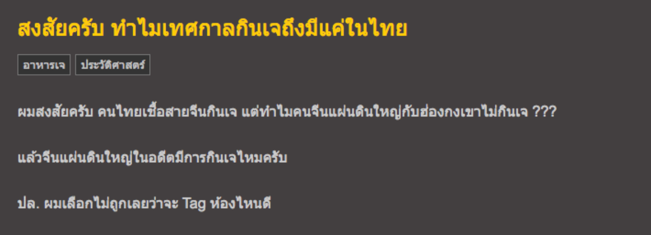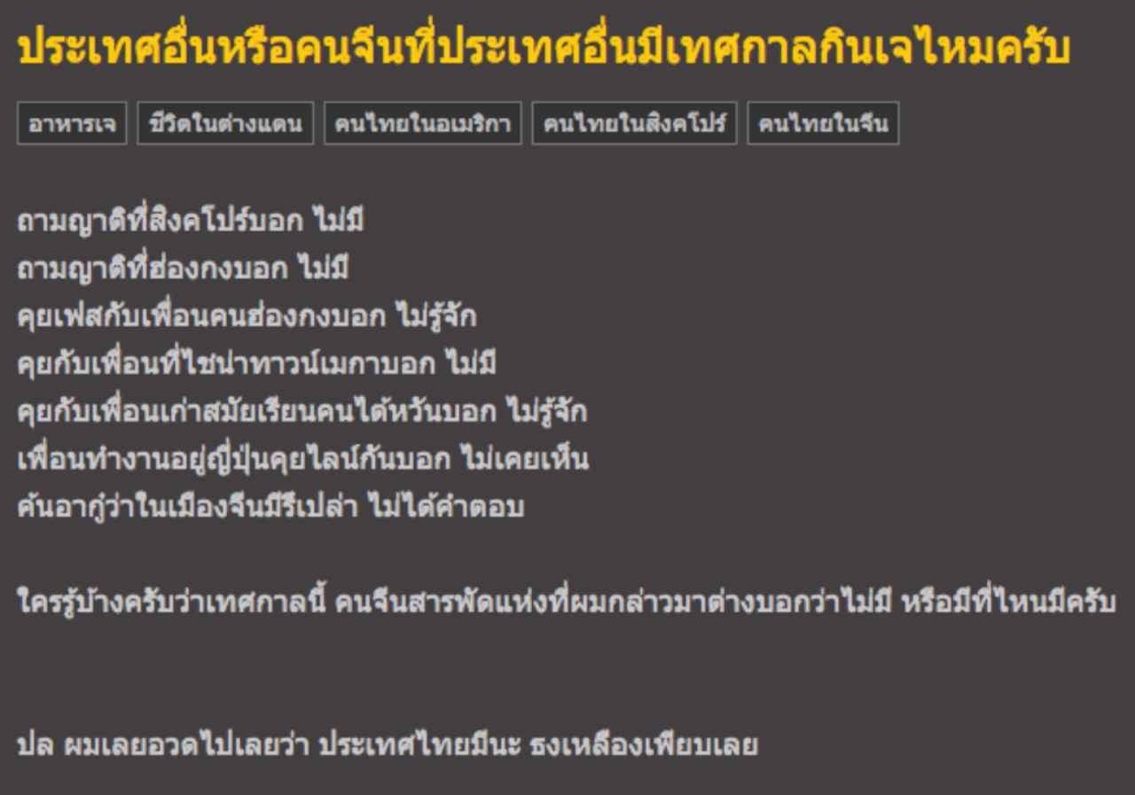 จากข้อสงสัยดังกล่าว ทีมข่าวไทยรัฐออนไลน์จึงได้รวบรวมความคิดเห็นของชาวเน็ตที่มาแลกเปลี่ยนความรู้ในเว็บไซต์พันทิป โดยส่วนใหญ่ระบุว่า คนจีนไม่ค่อยรู้จักการกินเจ จะมีแต่นักบวชหรือพระที่งดรับประทานเนื้อสัตว์ เนื่องจากการกินเจเร่ิมมาจากกลุ่มคนจีนส่วนน้อยที่อพยพมาจากประเทศจีนก่อนจะแพร่หลายมาเรื่อยๆ จนถึงปัจจุบัน นอกจากนี้บางแห่งยังเชื่อว่า กินเจ เพื่อถวายเป็นพุทธบูชาแด่พระมหาโพธิสัตว์กวนอิม เกี่ยวกับการกินเจอีก 6 ตำนาน ดังนี้