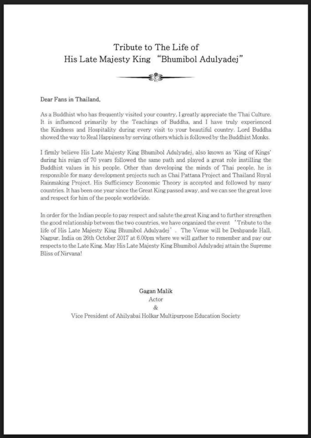 กาแกน มาลิค (Gagan Malik) นักแสดงหนุ่มชาวอินเดีย ส่งจดหมายแสดงความอาลัย ในหลวง ร.9 ด้วยความศรัทธาล้นเปี่ยม กล่าวว่าพระองค์คือกษัตริย์แห่งเหล่ากษัตริย์ทั้งปวง พร้อมเป็นเจ้าภาพจัดงานแสดงความอาลัยในอินเดีย 26 ต.ค.60