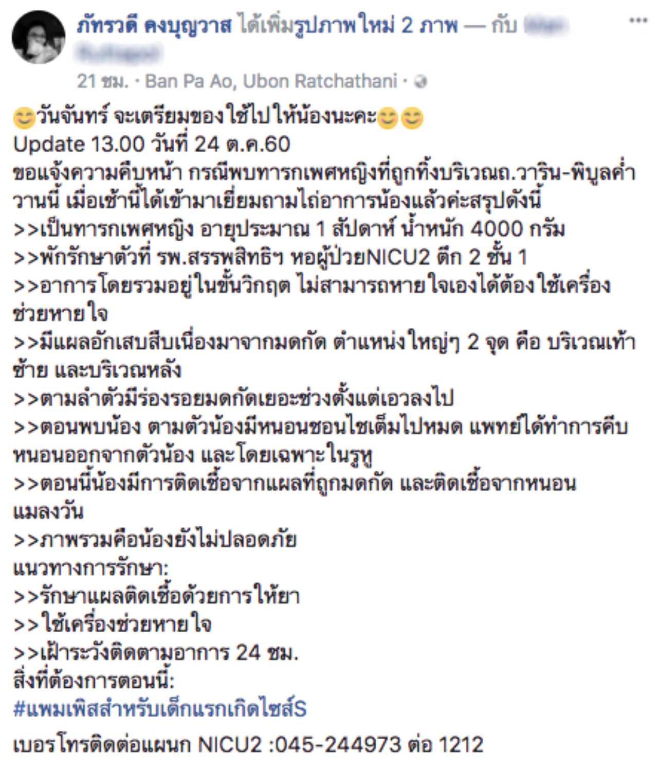 วันที่ 25 ต.ค.60 ผู้ใช้เฟซบุ๊ก ภัทรวดี คงบุญวาส ได้โพสต์ภาพเด็กทารกเพศหญิงคนหนึ่ง อายุประมาณ 1 สัปดาห์ มีแผลอักเสบจากการถูกมดกัดเต็มตัว เนื้อตัวมีคราบสกปรก โดยระบุว่า เด็กทารกถูกทิ้งเมื่อวันที่ 24 ต.ค.ที่ผ่านมา บริเวณ ถ.วาริน-พิบูล