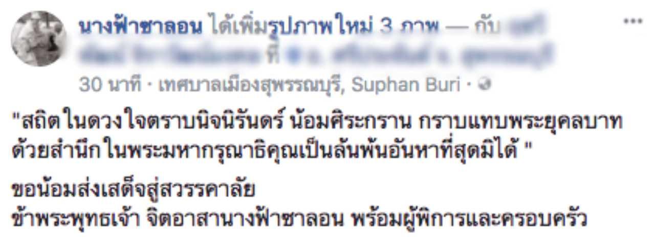 - นายฤชวีพัฒน์ จิราวัฒน์มงคล หรือ กอล์ฟ ช่างตัดผมจิตอาสา ผู้โด่งดังในโลกออนไลน์ในเพจนางฟ้าซาลอน ก็ได้โพสต์ข้อความแสดงความอาลัยว่า "สถิตในดวงใจตราบนิจนิรันดร์ น้อมศิระกราน กราบแทบพระยุคลบาท ด้วยสำนึกในพระมหากรุณาธิคุณเป็นล้นพ้นอันหาที่สุดมิได้ ขอน้อมส่งเสด็จสู่สวรรคาลัย ข้าพระพุทธเจ้า จิตอาสานางฟ้าซาลอน พร้อมผู้พิการและครอบครัว"