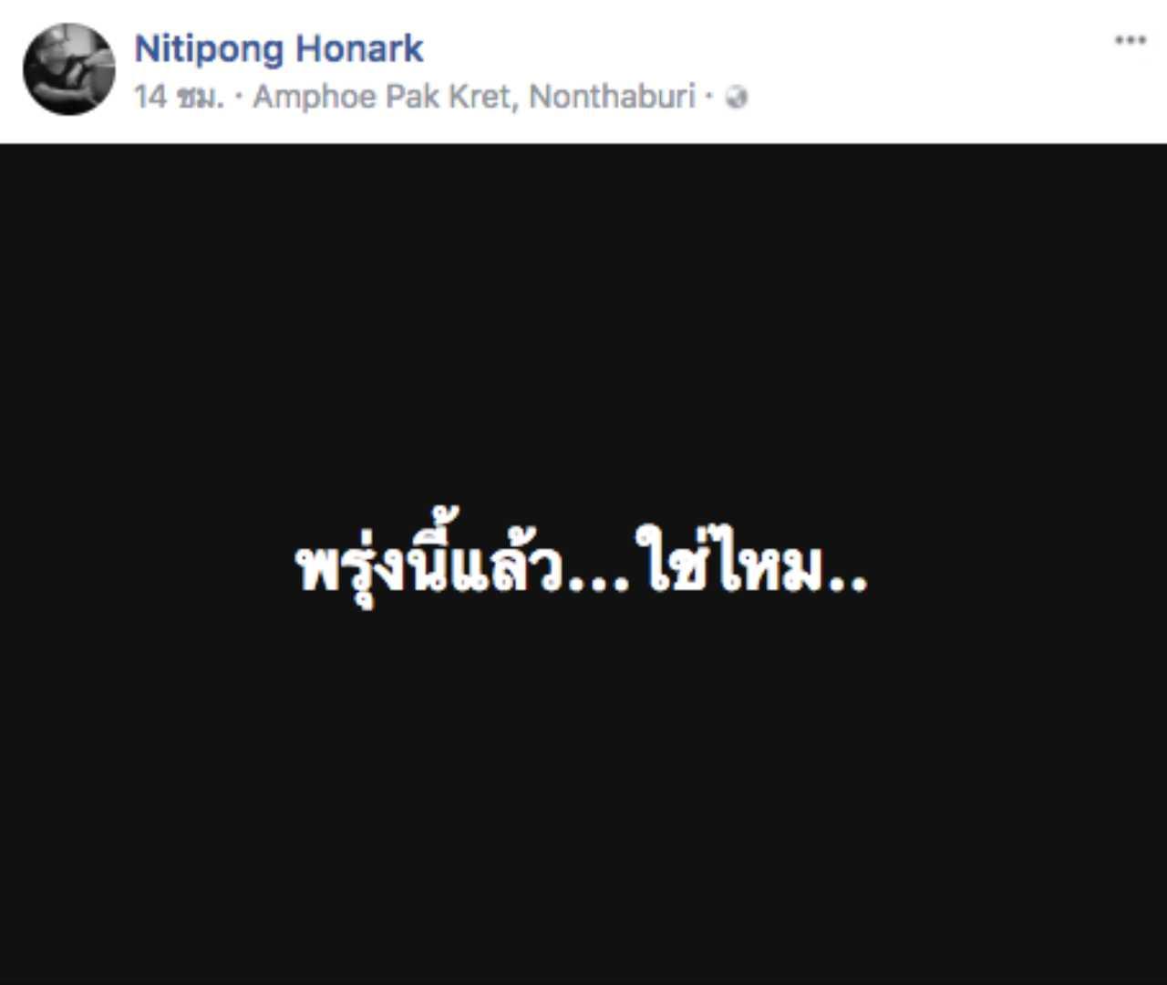 - ดี้ นิติพงษ์ ห่อนาค นักแต่งเพลงชื่อดัง ได้โพสต์ภาพข้อความผ่านเฟซบุ๊กส่วนตัวเป็นภาพพื้นหลังสีดำ เมื่อวานนี้ (25 ต.ค.60) ว่า "พรุ่งนี้แล้ว...ใช่ไหม.."