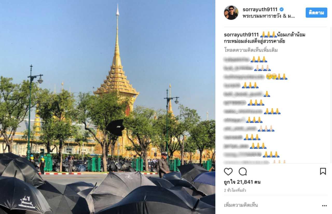 - สรยุทธ สุทัศนะจินดา อดีตผู้ประกาศข่าวและพิธีกรชื่อดัง ได้โพสต์ภาพและข้อความผ่านอินสตาแกรมส่วนตัวขณะอยู่บริเวณท้องสนามหลวงว่า "น้อมเกล้าน้อมกระหม่อมส่งเสด็จสู่สวรรคาลัย"