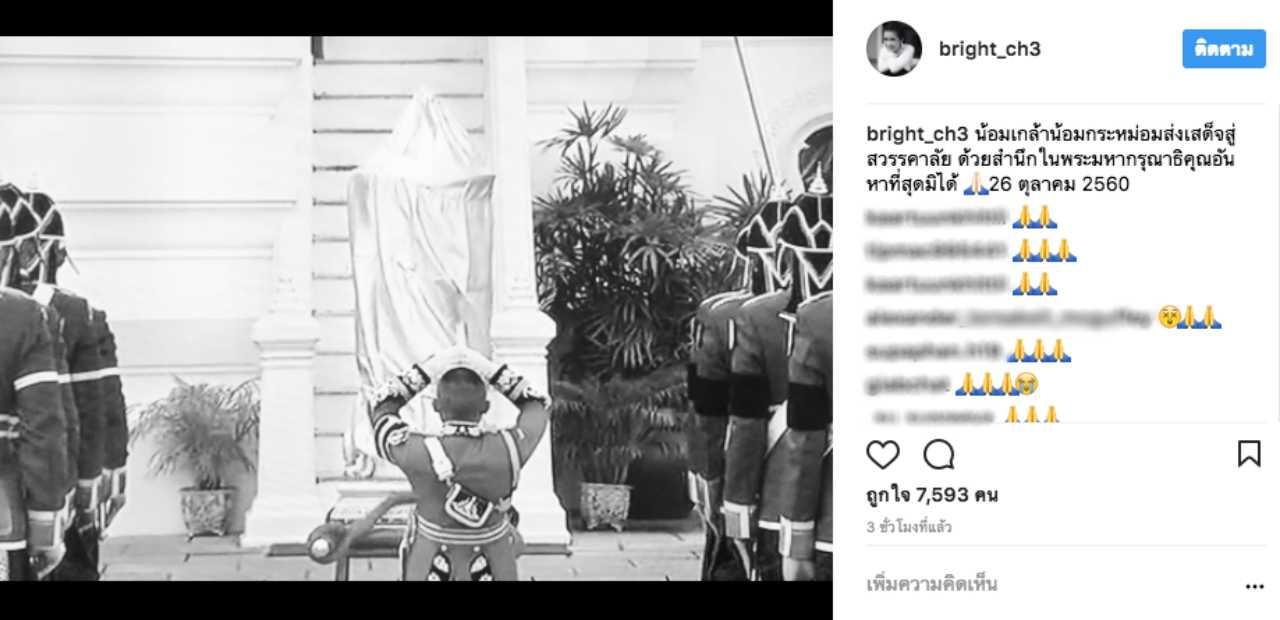 - ไบรท์ พิชญทัฬห์ จันทร์พุฒ พิธีกรสาวชื่อดัง ได้โพสต์ภาพพระราชพิธีฯ พร้อมกับข้อความว่า "น้อมเกล้าน้อมกระหม่อมส่งเสด็จสู่สวรรคาลัย ด้วยสำนึกในพระมหากรุณาธิคุณอันหาที่สุดมิได้ 26 ตุลาคม 2560"