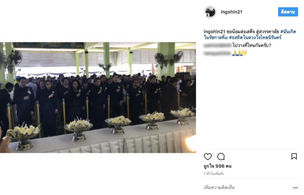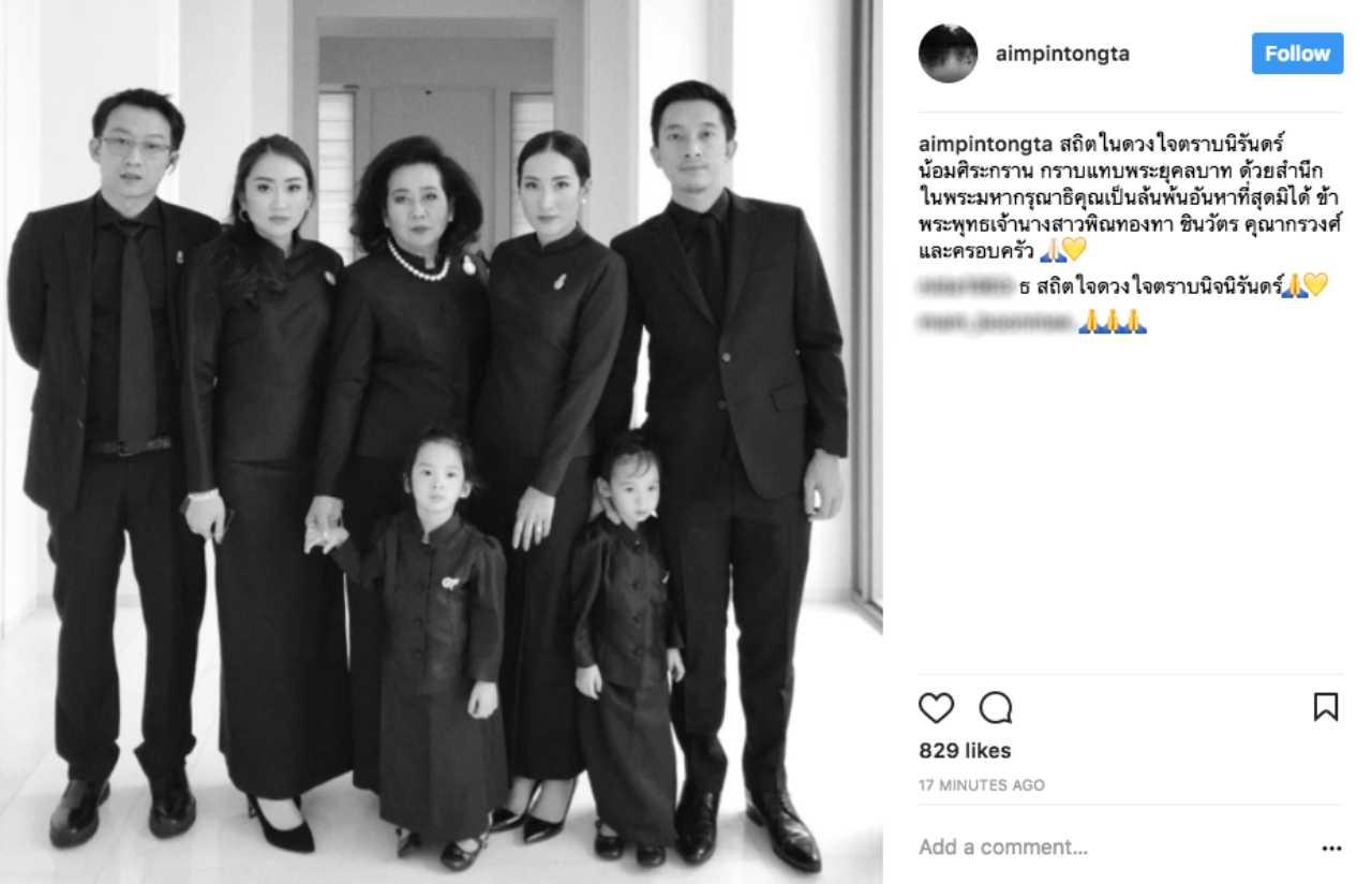 - น.ส.แพทองธาร ชินวัตร บุตรสาว นายทักษิณ ชินวัตร อดีตนายกรัฐมนตรี โพสเฟซบุ๊กส่วนตัว ลงข้อความว่า ขอน้อมส่งเสด็จ สู่สวรรคาลัย #ฉันเกิดในรัชกาลที่๙ #ธสถิตในดวงใจไทยนิรันดร์ พร้อมคลิปวิดีโอเป็นภาพ คนในครอบครัวชินวัตร ทั้ง คุณหญิง พจมาน ณ ป้อมเพชร นายพานทองแท้ ชินวัตร บุตรชายนายทักษิณ นางพินทองทา คุณากรวงศ์ บุตรสาว นายทักษิณ และครอบครัว ได้ร่วมถวายดอกไม้จันทน์ ในพระราชพิธี ถวายพระเพลิงพระบรมศพพระบาทสมเด็จพระปรมินทร มหาภูมิพลอดุลยเดช
