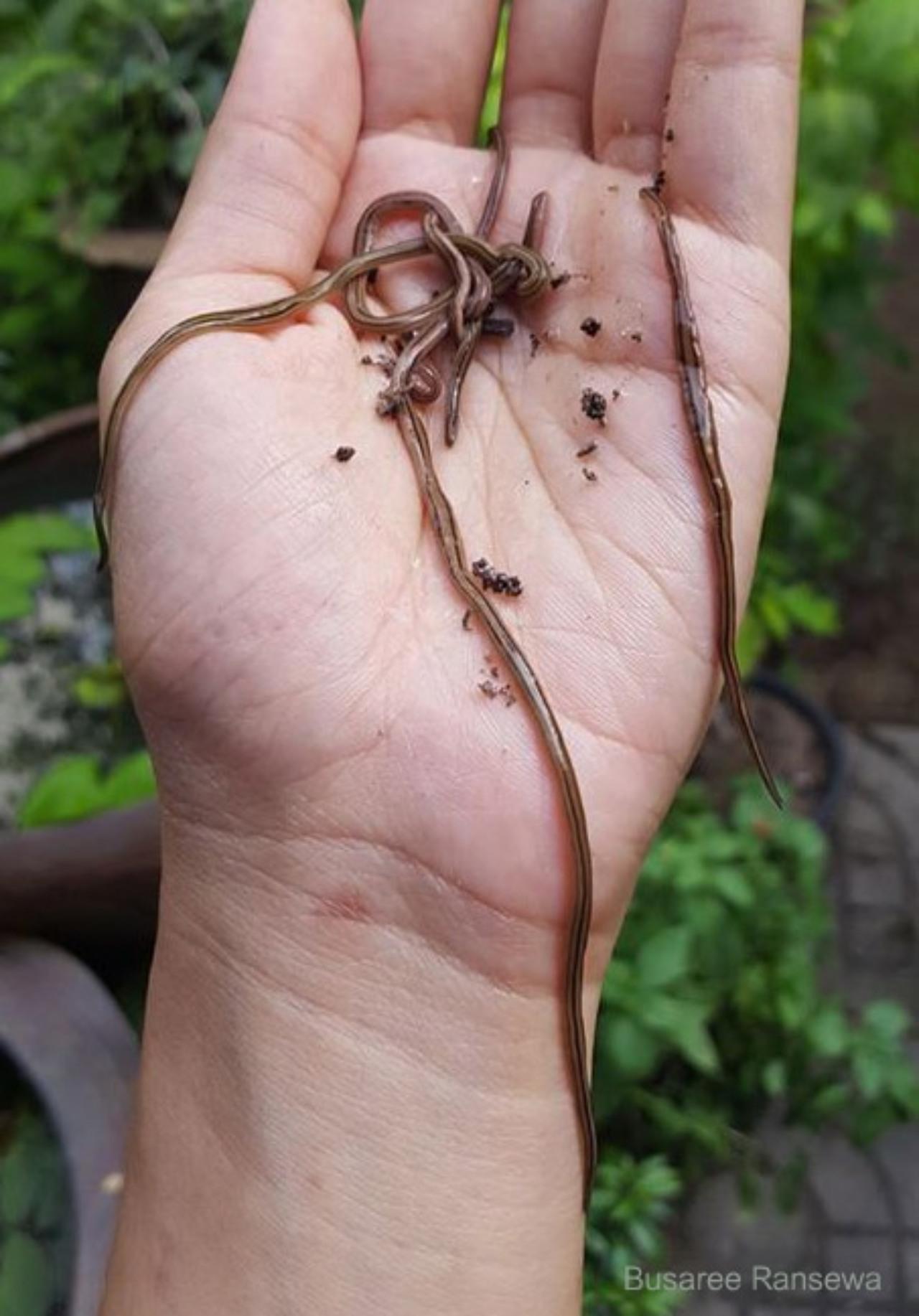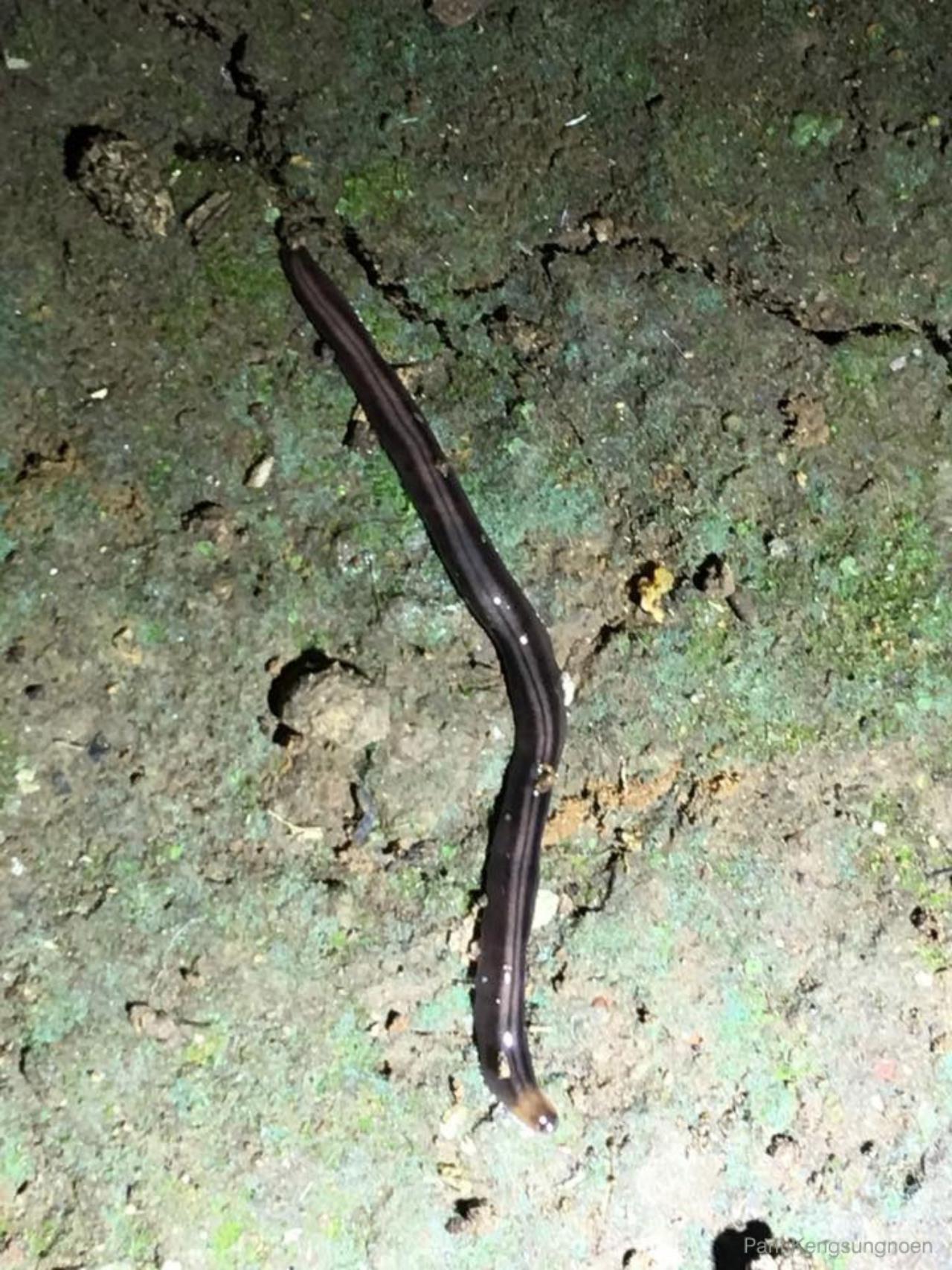 สังเกตง่ายๆ หัวมันจะแยกออกเป็นแฉกๆ ตัวนี้เป็นนักล่าไส้เดือนท้องถิ่นของเรามีหลายชนิดหลายสี หลายทรงเลย เอาตัวธรรมดาๆ ที่สีคล้ายหนอนตัวแบนนิวกินีที่สุดมาให้ดู (จริงๆ มีเท่านี้ของคนอื่นเค้ามีแต่ตัวสวยๆ กัน)