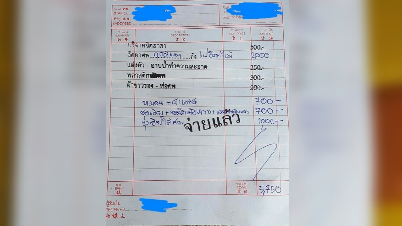 พร้อมกับโพสต์ภาพใบเสร็จค่าทำศพของโรงพยาบาลแห่งหนึ่ง ที่ญาติผู้เสียชีวิตต้องจ่ายเป็นจำนวนเงิน 5,750 บาท โดยแบ่งเป็นค่าบริจาคจิตอาสา 500 บาท ฉีดยาศพ 2,000 บาท แต่งตัว-อาบน้ำทำความสะอาด 350 บาท พลาสติกห่อศพ 300 บาท ผ้าขาวรอง-ห่อศพ 200 บาท