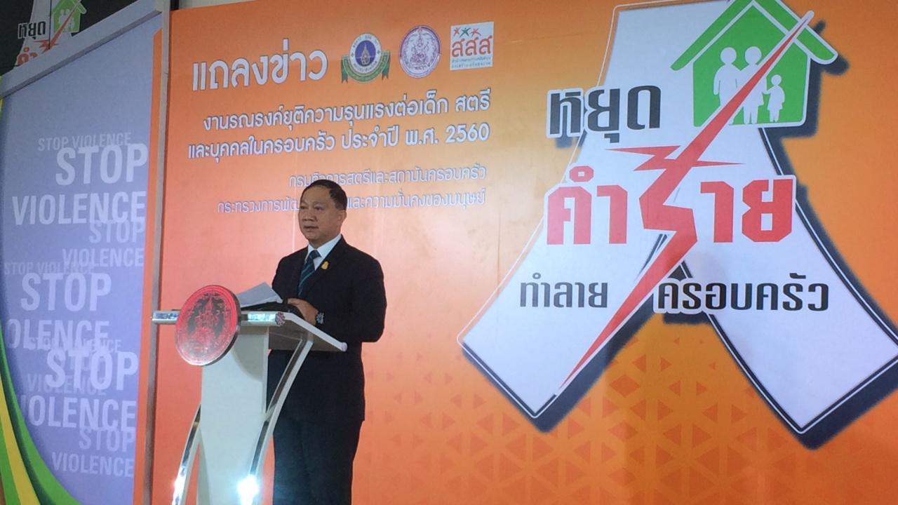 เมื่อวันที่ 16 พ.ย.2560 พล.ต.อ.อดุลย์ แสงสิงแก้ว รมว.การพัฒนาสังคมและความมั่นคงของมนุษย์ (พม.) กล่าวแถลงข่าวการจัดงานรณรงค์ยุติความรุนแรงต่อเด็ก สตรี และบุคคลในครอบครัว ประจำปี พ.ศ. 2560 ภายใต้แนวคิด “สร้างครอบครัวไร้รุนแรง ด้วยสื่อสารที่สร้างสรรค์” ว่า ความรุนแรงในครอบครัวมีแนวโน้มเพิ่มมากขึ้น พม.โดยกรมกิจการสตรีและสถาบันครอบครัว (สค.) ได้จัดกิจกรรมรณรงค์อย่างต่อเนื่อง โดยเฉพาะเดือนพ.ย.ถือเป็นเดือนรณรงค์ยุติความรุนแรงต่อเด็กและสตรี ทั้งนี้ปัจจัยที่ก่อให้เกิดความรุนแรงนอกจากการดื่มสุรายาเสพติดแล้ว อีกปัจจัยสำคัญคือการใช้วาจาที่ไม่เหมาะสม