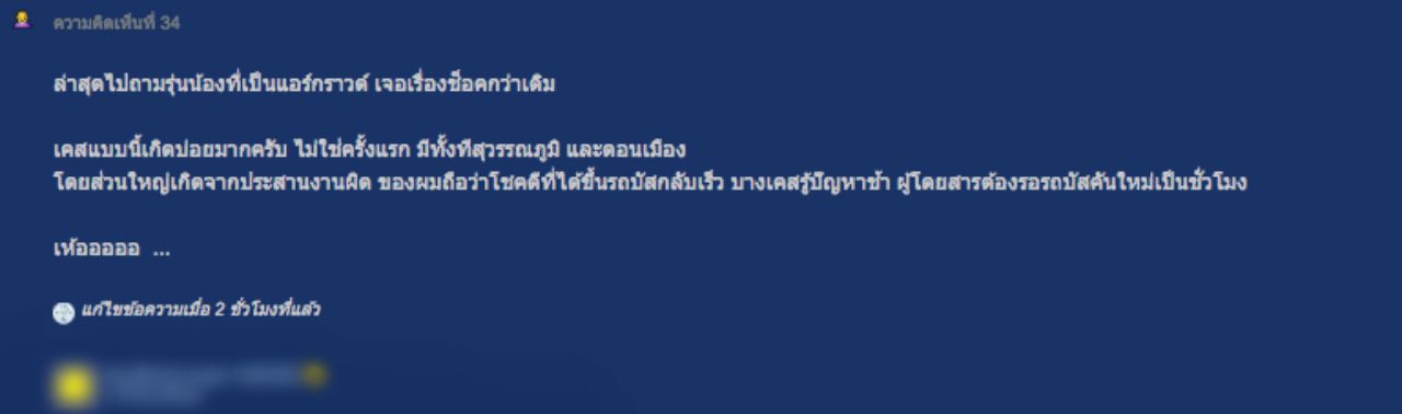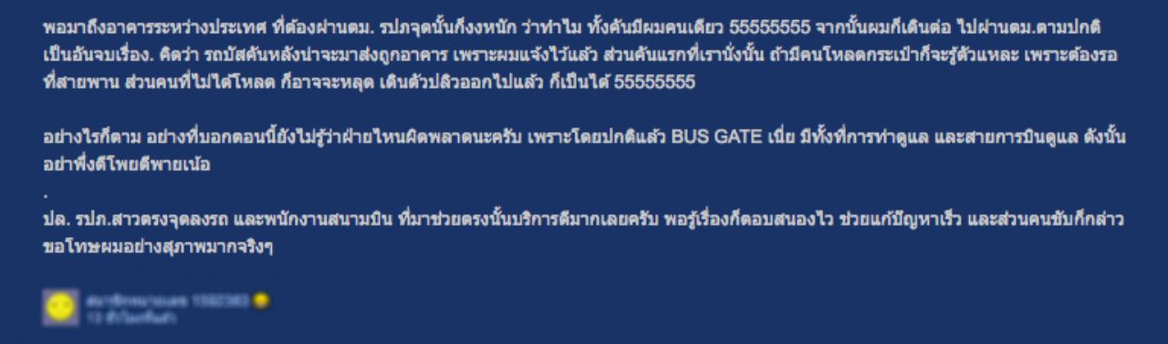 เจ้าของกระทู้ ระบุต่อว่า "อย่างที่บอกตอนนี้ยังไม่รู้ว่าฝ่ายไหนผิดพลาดนะครับ เพราะโดยปกติแล้ว BUS GATE เนี่ย มีทั้งที่การท่าดูแล และสายการบินดูแล ดังนั้นอย่าเพิ่งตีโพยตีพายเน้อ" และจากการสอบถามรุ่นน้องที่เป็นแอร์กราวด์ ได้เล่าว่า เหตุการณ์ดังกล่าวไม่ได้เกิดขึ้นครั้งแรก โดยส่วนใหญ่เกิดจากการประสานงานผิด.