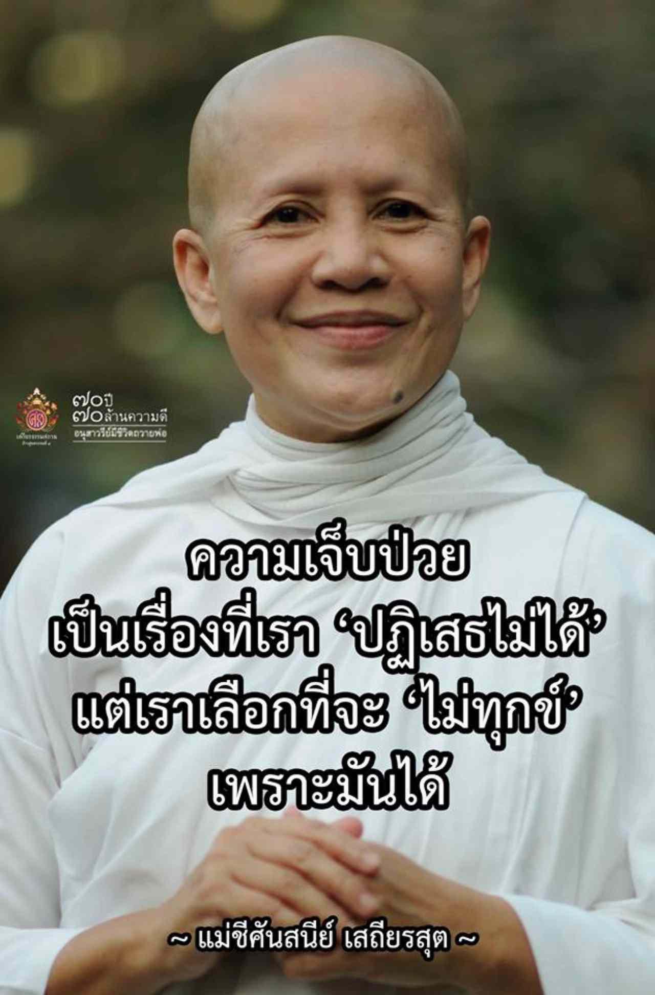 แม่ชีศันสนีย์ เสถียรสุต กล่าวว่า หลายคนบอกว่า มะเร็งเป็นโรคของกรรมเก่า แต่แม่มองว่า มะเร็งเป็นเรื่องของพฤติกรรม ถ้าเราประมาท เราก็ต้องให้ความอ่อนโยนของร่างกายของเรา เมื่อวานแม่กลับจากโรงพยาบาลศิริราช หมอที่ดูแล บอกว่า ดีใจที่เห็นคุณแม่แข็งแรงขึ้น