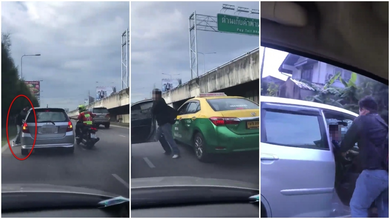 รถหลังอัดคลิปชายเกาะหน้ารถเก๋งคันหน้า ลงมาทุบกระจกร้าว ก่อนวิ่งมากระชากหญิงคนขับออกจากรถ อ้างเป็นสามี พยายามเคลียร์ปัญหากันแต่ไม่จบ