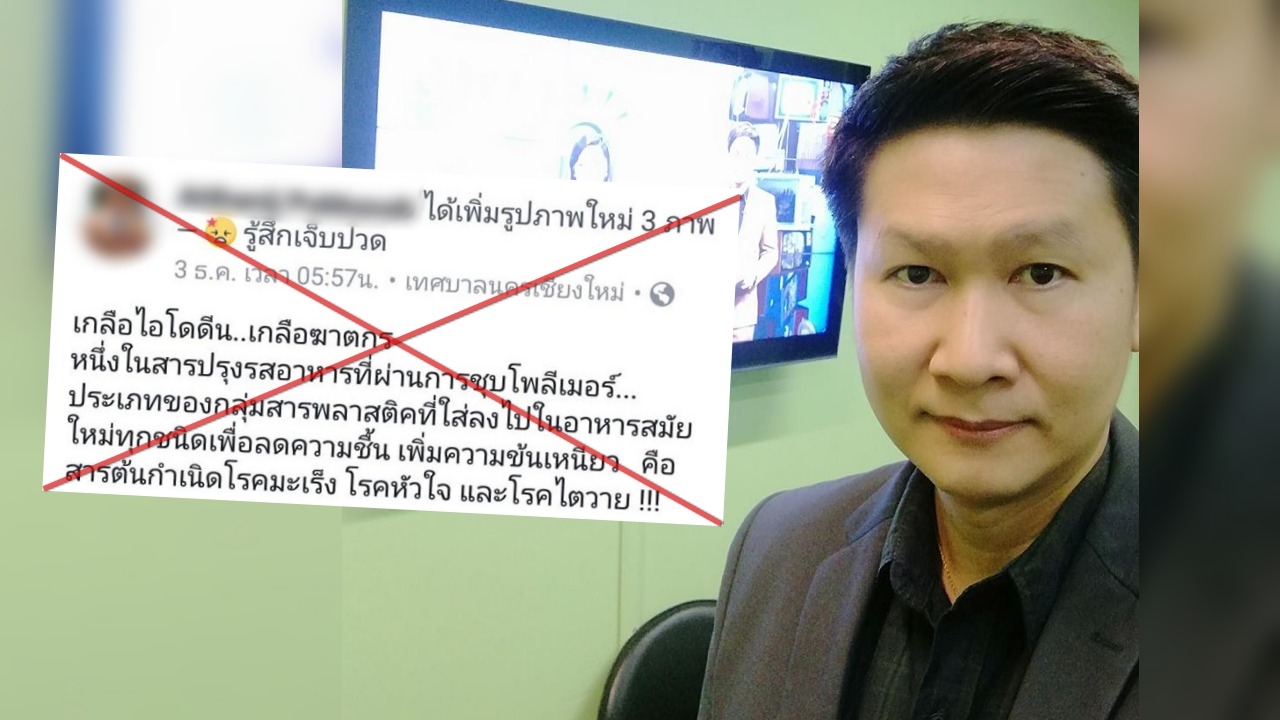 โดยระบุว่า จากกระแสข่าวที่บอกว่า "เกลือไอโอดีน" ผ่านการชุบโพลีเมอร์ ทำให้โครงสร้างเปลี่ยนจากโซเดียมคลอไรด์ เป็นโซเดียมซัลเฟต เมื่อกินเข้าไปร่างกายจะขับออกไม่ได้ ทำให้เป็นโรคมะเร็ง โรคหัวใจ และโรคไตวาย เป็นข่าวมั่ว
