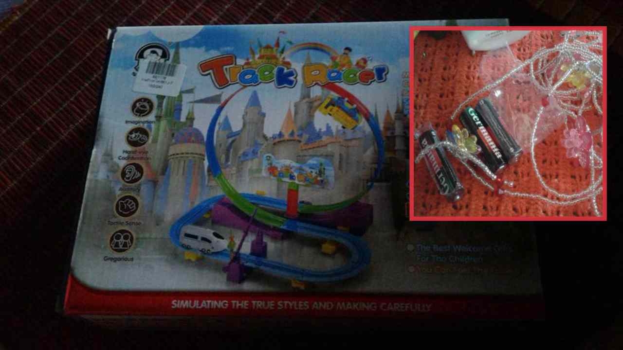 ผู้ใช้เฟซบุ๊ก น.ส.พัชรัตน์ เมรี่ สาระศาลิน โพสต์ภาพพร้อมระบุว่า เจ็บใจมาก ซื้อรถไฟได้สร้อยเด็กเล่น ความชะล่าใจนึกว่าเขาหยิบกล่องใหม่ให้ งานสะพานข้ามแม่น้ำแควเมื่อคืนนี้ และอยากฝากเตือนว่าซื้อของเล่นให้เปิดกล่องดูก่อนที่จะรับสินค้ามา เพื่อความมั่นใจว่าได้ของครบ