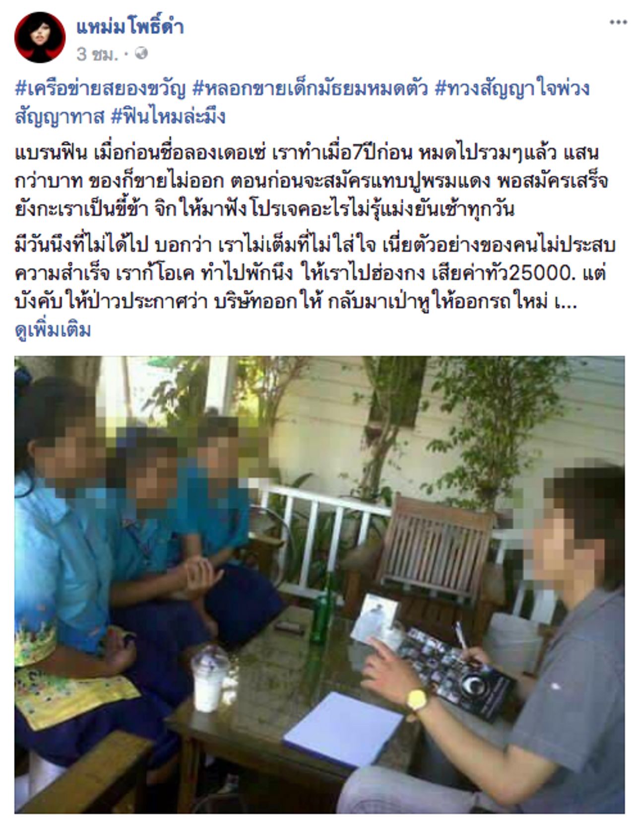 วันที่ 7 ธ.ค.60 เพจเฟซบุ๊กชื่อดัง แหม่มโพธิ์ดำ โพสต์ข้อความจากเรื่องเล่าของแฟนเพจที่ตกเป็นเหยื่อของธุรกิจลูกโซ่ว่า เมื่อ 7 ปีก่อน ได้สมัครเป็นตัวแทนขายของแบรนด์ชื่อดังแห่งหนึ่ง หมดเงินไปกว่า 1 แสนบาท แต่สิ่งที่ได้รับกลับมาคือถูกเรียกให้ไปฟังโปรเจ็กต์ ให้ซื้อทัวร์ไปต่างประเทศ เสียเงินเอง 25,000 บาท แต่ถูกบังคับให้บอกว่าบริษัทออกค่าใช้จ่ายให้ และยังต้องเสียเงินออกรถยนต์คันใหม่จนทะเลาะกับแฟน ร้องไห้ แต่บริษัทกลับพูดว่า เราอ่อนแอ ไล่ให้กลับไปร้องไห้ที่บ้าน พอเราออกจากธุรกิจก็นำเราไปพูดในทางเสียหาย