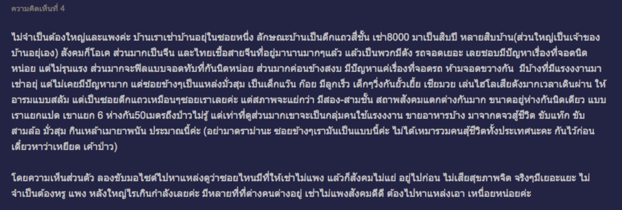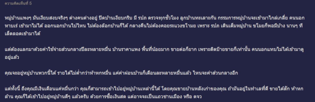 แต่ในความจริงแล้ว นิยามคำว่าความสุขของแต่ละคนก็ต่างกันออกไป โดยมีสมาชิกเว็บไซต์คนอื่นๆ ได้เข้ามาให้กำลังใจ และแชร์ประสบการณ์ชีวิตว่า ไม่จำเป็นต้องมีบ้านหลังใหญ่และแพง เพราะบ้านเช่า หรือบ้านหลังเล็กๆ ที่สภาพแวดล้อมดียังมีอยู่ และไม่เถียงว่าหมู่บ้านราคาแพงมันสงบจริงๆ เพราะต่างคนต่างอยู่ มี รปภ.ดูแล 24 ชม. ไม่ต้องกลัวคนขโมยของ แต่ก็ต้องแลกมาด้วยค่าส่วนกลางราคาแพง พื้นที่ใช้สอยน้อย