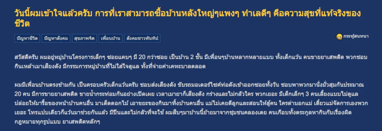 หนุ่มเครียดสะสม ตั้งกระทู้ บ้านโครงการหรู คือความสุขที่แท้จริงของชีวิต หลังเจอเพื่อนบ้านค้ายาเสพติด ตั้งวงกินเหล้า สภาพแวดล้อมแย่ จนเกือบหาความสุขไม่เจอ