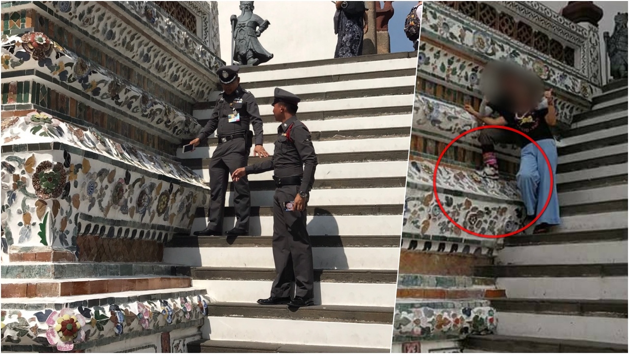 โซเชียลเดือด จวกไกด์คนไทยโพสท่าเหยียบกระเบื้องฐานพระปรางค์วัดอรุณ ล่าสุด ตำรวจ สน.บางกอกใหญ่ ลงพื้นที่ตรวจสอบ จ่อเรียกสอบปากคำ