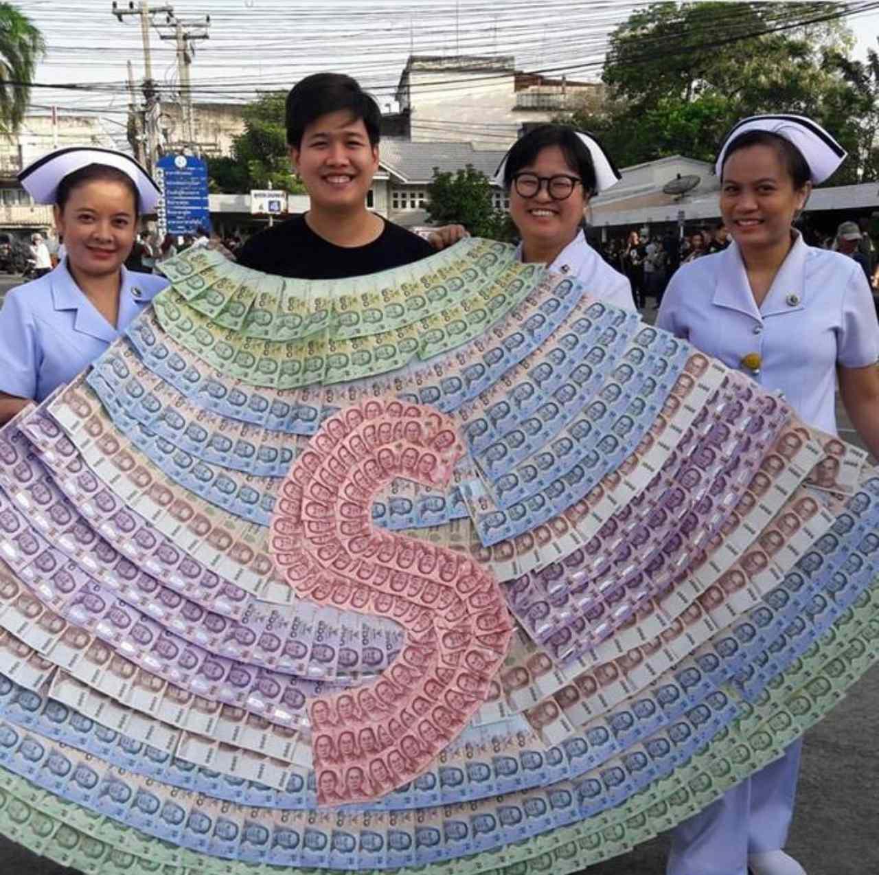 9. โปสเตอร์พี่ตูนใส่กระโปรงที่ทำจากแบงก์