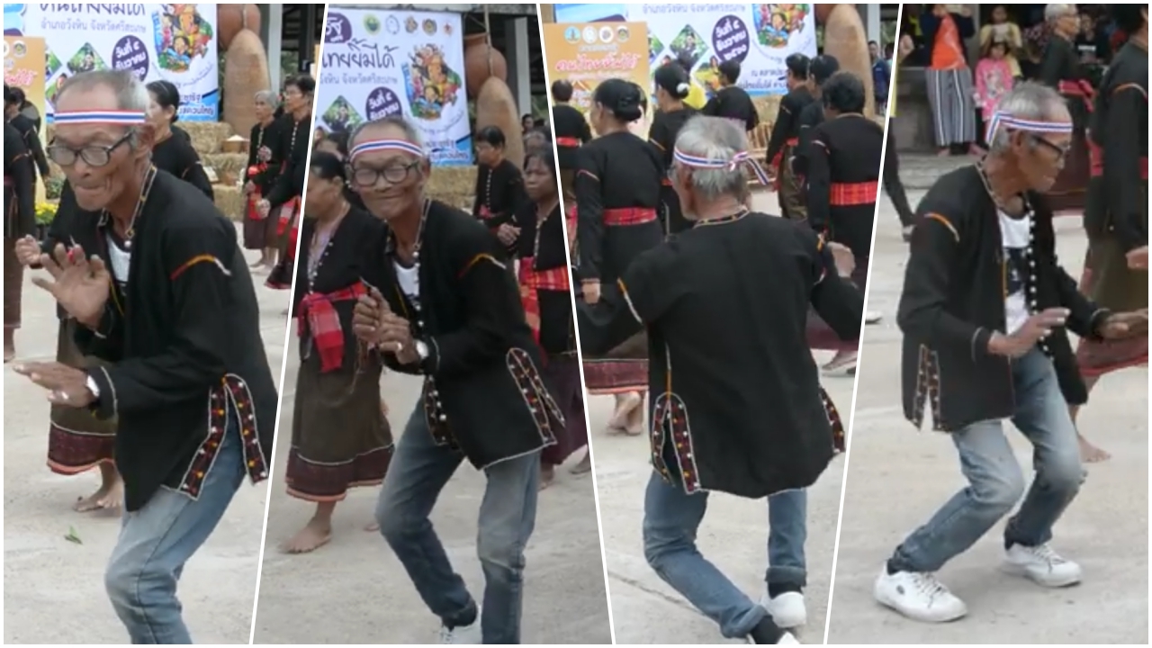 ซึ่งคลิปนี้มีคุณตาท่านหนึ่งดูจะมีความสุข สนุกสนานและมีดนตรีในหัวใจมากกว่าเพื่อนร่วมชั้นอยู่มาก ออกท่าทางพลิ้วด้วยสีหน้ามีความสุขเหลือเกิน ซึ่งเพลงประกอบในการเต้นนี้คือเพลงผู้สาวขาเลาะ