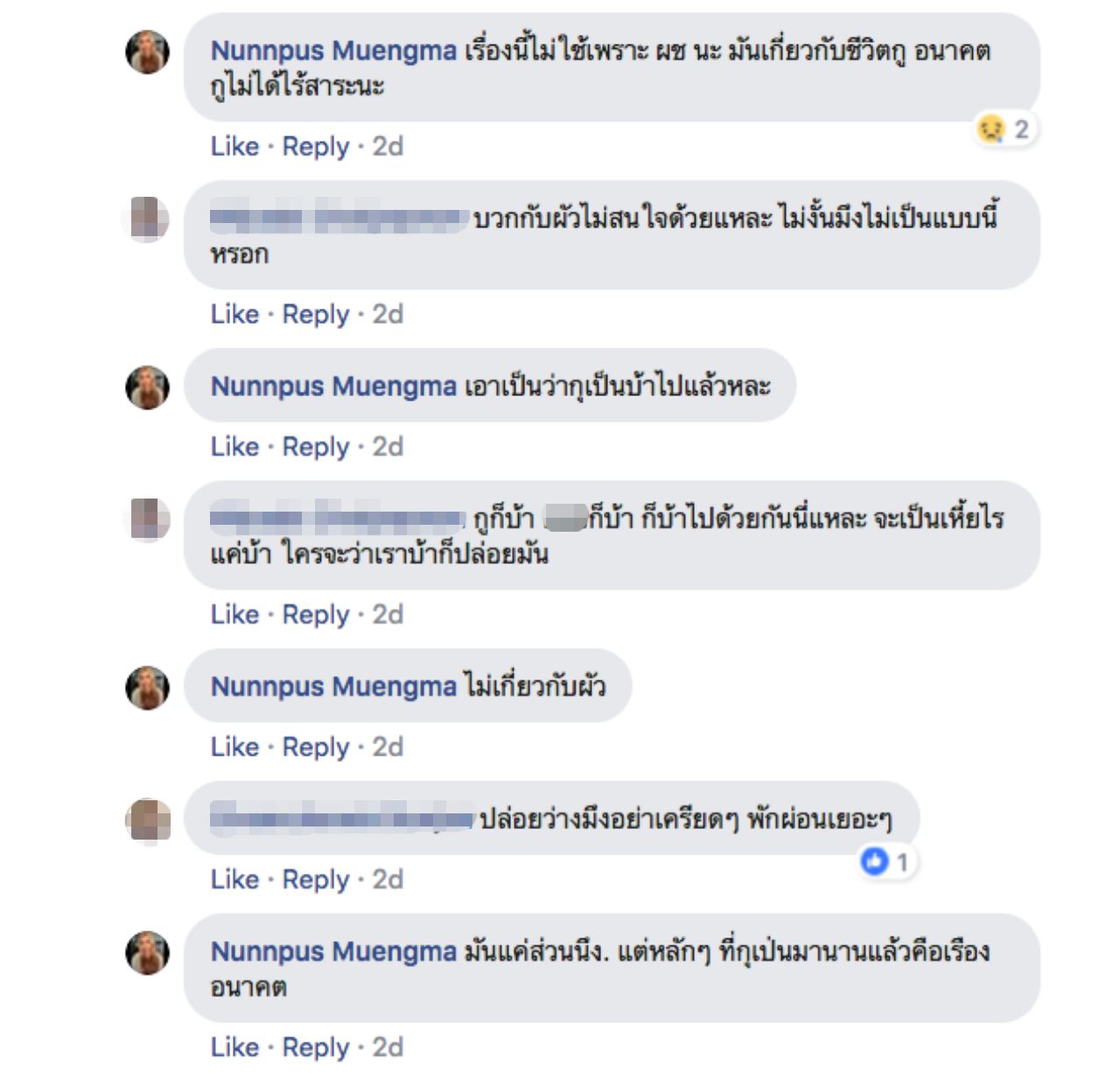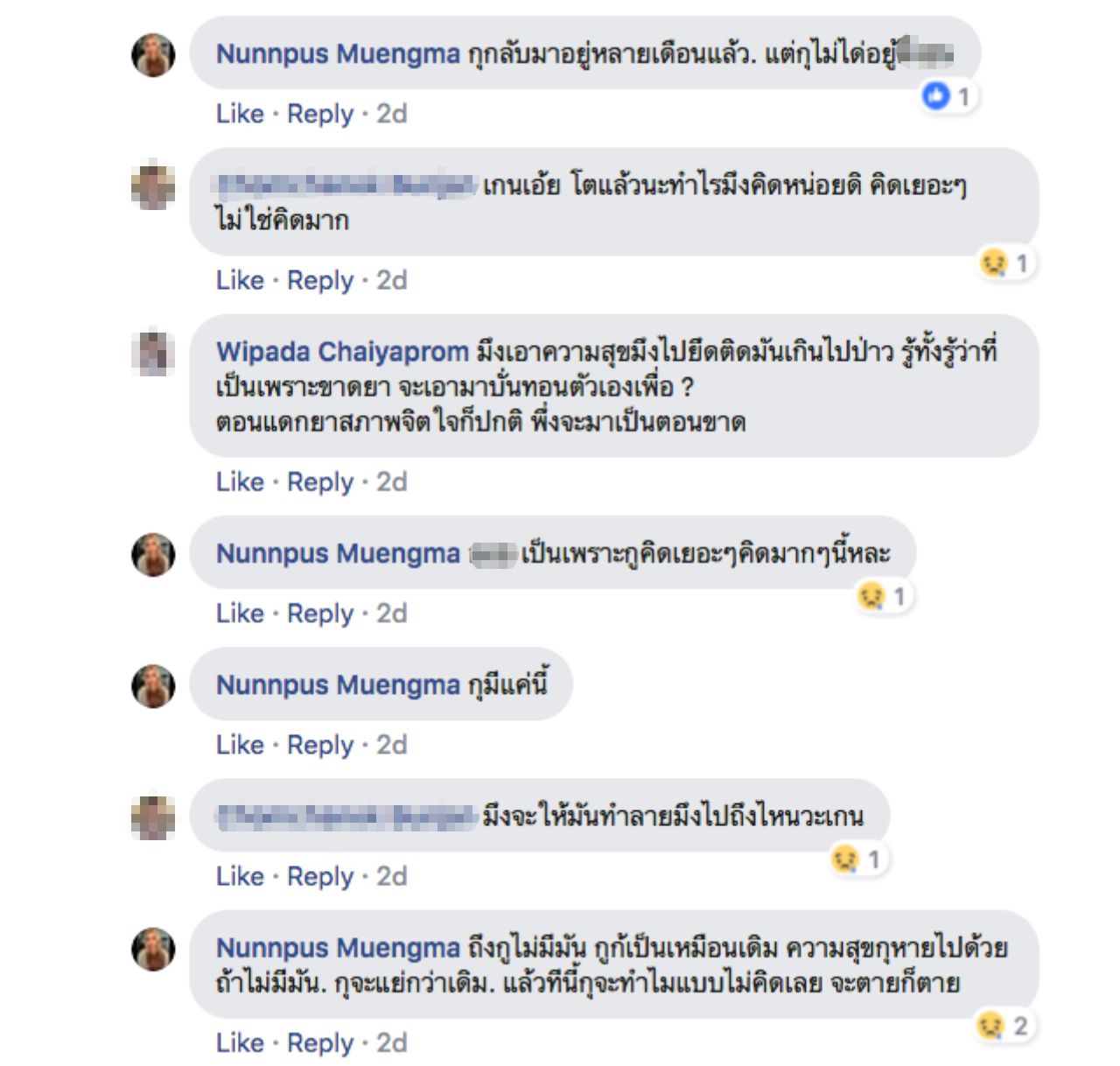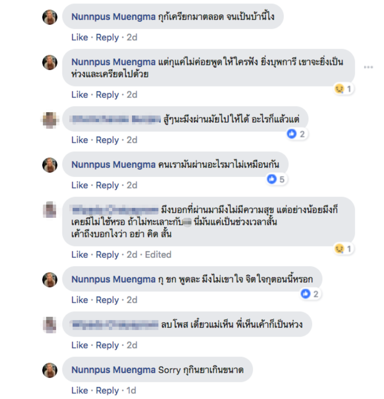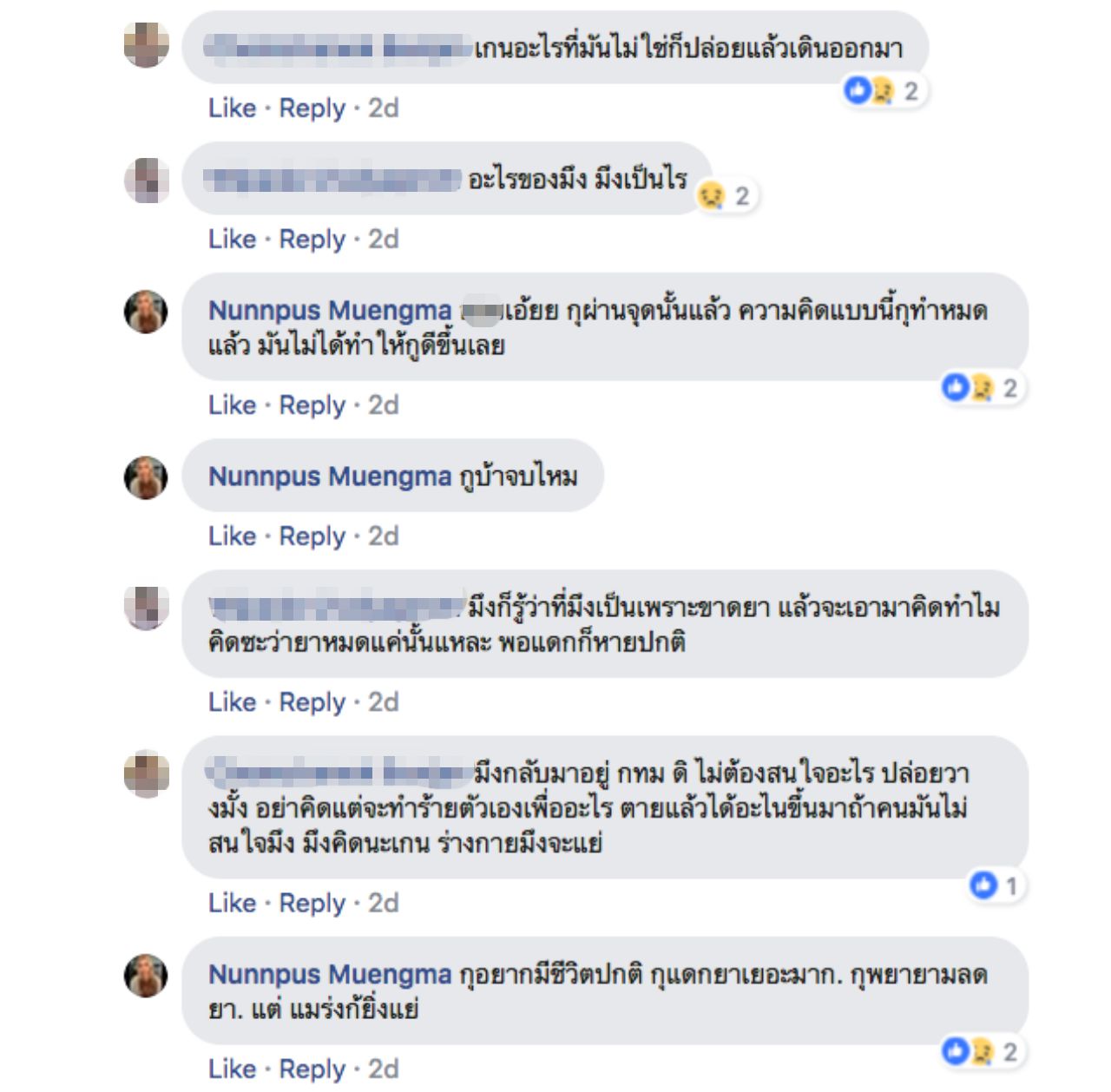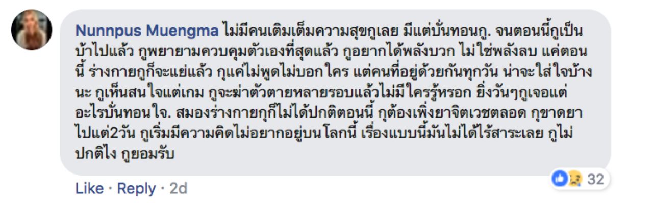 จากนั้น น้องเกน ได้โพสต์ต่อในคอมเมนต์ของโพสต์นี้ว่า “ไม่มีคนเติมเต็มความสุขเลย มีแต่บั่นทอน จนตอนนี้เป็นบ้าไปแล้ว พยายามควบคุมตัวเองที่สุดแล้ว อยากได้พลังบวก ไม่ใช่พลังลบ แค่ตอนนี้ร่างกายก็จะแย่แล้ว แค่ไม่พูดไม่บอกใคร แต่คนที่อยู่ด้วยกันทุกวันน่าจะใส่ใจบ้างนะ จะฆ่าตัวตายหลายรอบแล้วไม่มีใครรู้หรอก ยิ่งวันๆ เจอแต่อะไรบั่นทอนใจ สมองร่างกายก็ไม่ได้ปกติตอนนี้ ต้องพึ่งยาจิตเวชตลอด ขาดยาไป 2 วัน เริ่มมีความคิดไม่อยากอยู่บนโลกนี้ เรื่องแบบนี้มันไม่ได้ไร้สาระเลย ไม่ปกติไง ยอมรับ”