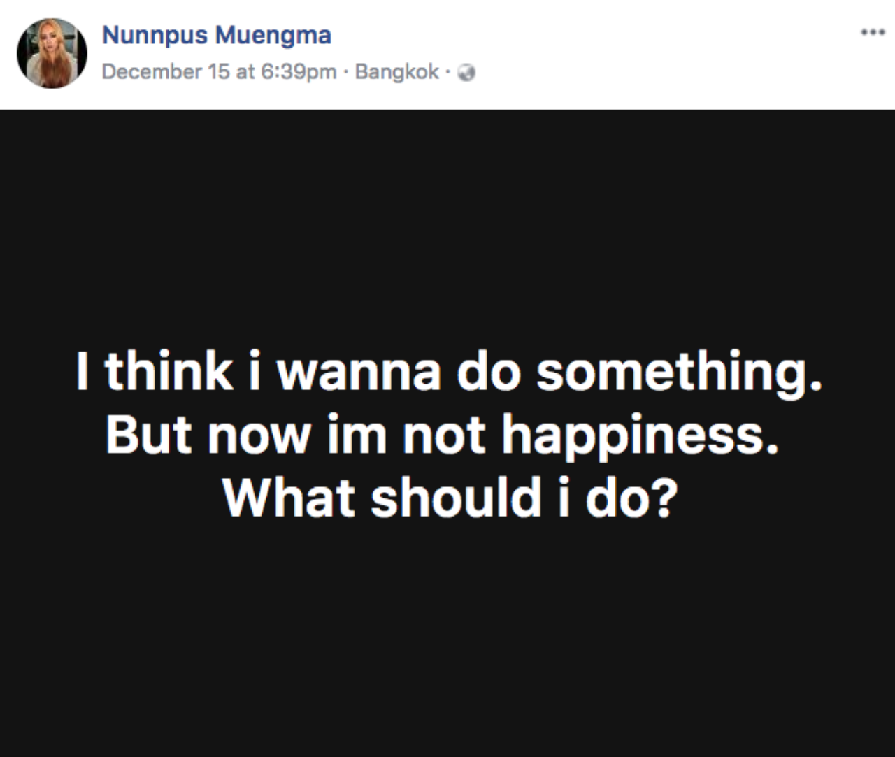 ทั้งนี้ เมื่อวันที่ 15 ธ.ค. 60 ที่ผ่านมา น้องเกน ได้โพสต์ผ่านเฟซบุ๊ก Nunnpus Muengma เป็นภาษาอังกฤษแปลได้ว่า “ฉันคิดว่าฉันอยากทำอะไรบางอย่าง แต่ตอนนี้ฉันไม่มีความสุข ฉันควรทำอย่างไร?”