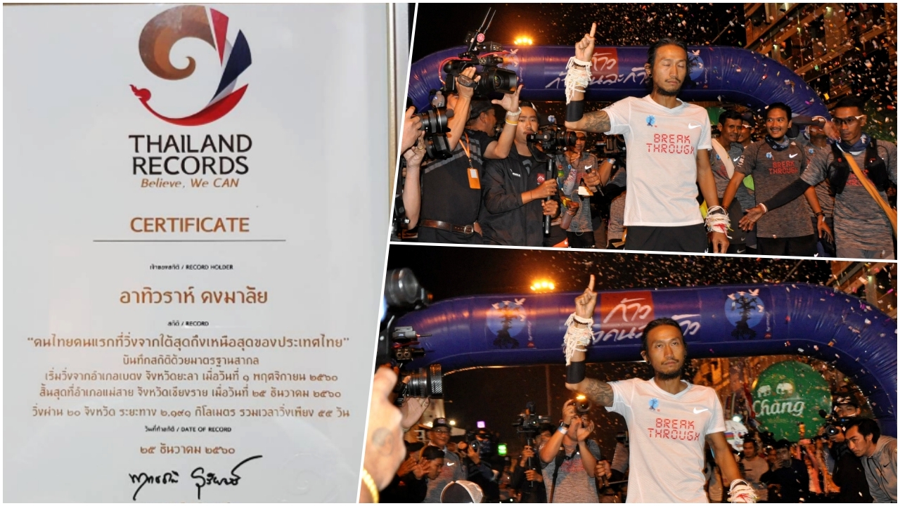 “ตูน บอดี้สแลม” และ “ก้อย รัชวิน” โพต์ภาพใบรับรองสถิติจาก THAILAND RECORDS ว่า “อาทิวราห์ คงมาลัย” เป็นคนไทยคนแรกที่วิ่งจากเบตง ถึงแม่สาย ในเวลาเพียง 55 วัน