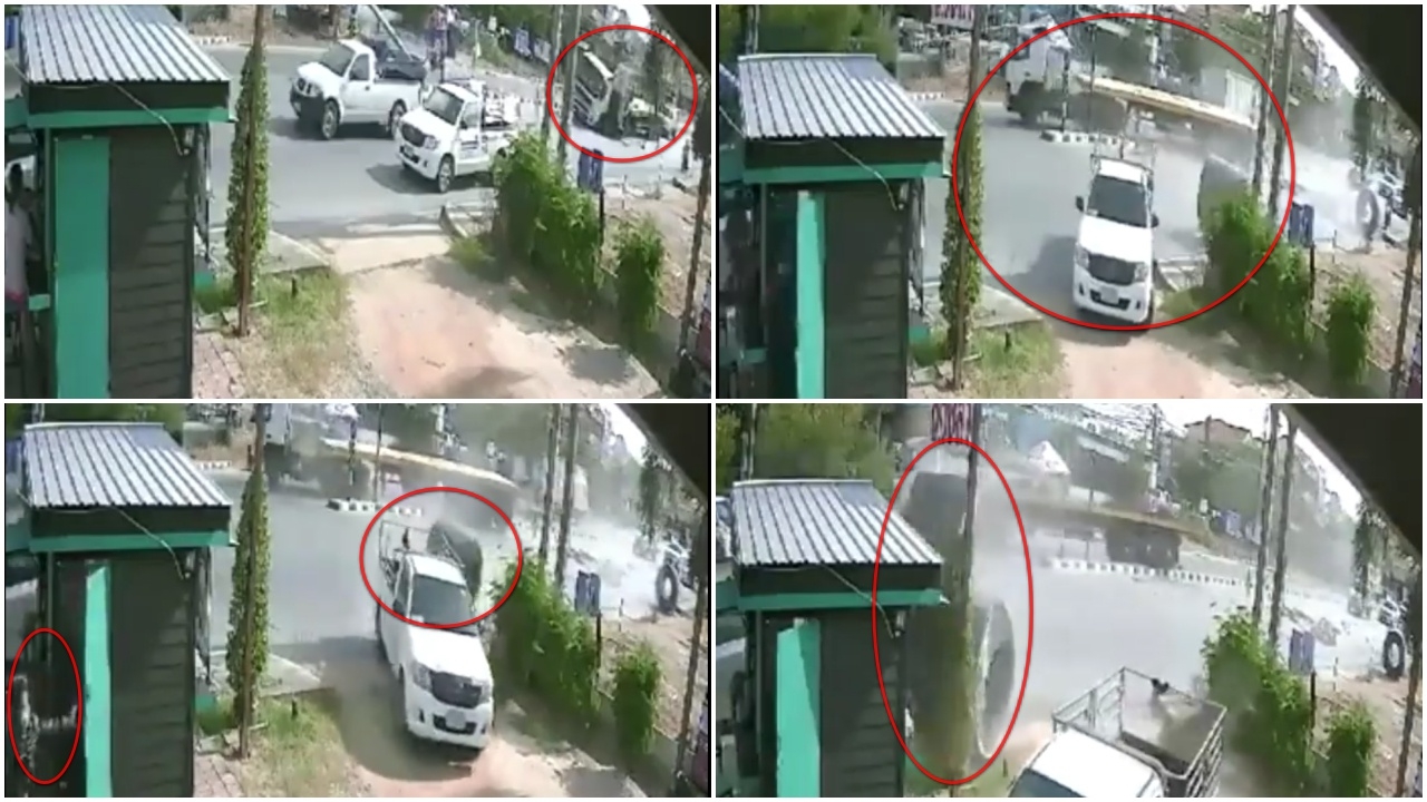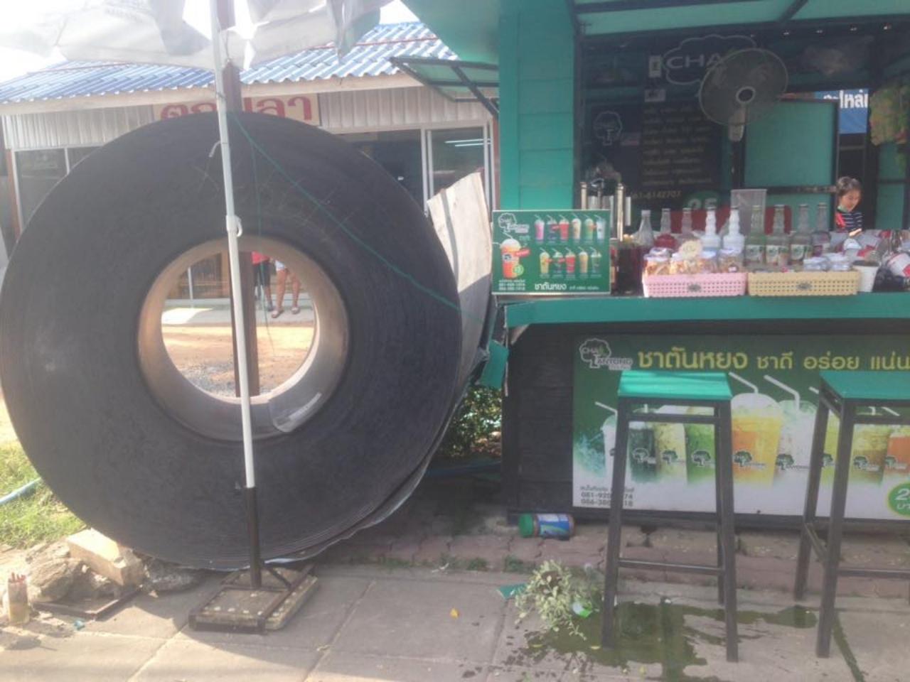 แต่ที่หวาดเสียวที่สุดคือ รถคันสีขาวที่มาจอดริมถนนแต่โชคดีที่ขับรถยังไม่ลงจากรถรีบเบี่ยงขึ้นฟุตปาทข้างร้านขายน้ำสีเขียว โดยมีม้วนคอยล์เหล็กกลิ้งตามมาด้วยความเร็วรอดไปได้อย่างเฉียดฉิว ส่วนม้วนคอยล์เหล็กก็กลิ้งมาหยุดที่ร้านดังกล่าวโดนที่ร้านได้รับความเสียหายไม่มาก ส่วนคนขายและลูกค้าก็วิ่งหนีเอาชีวิตรอดได้ทันเวลา