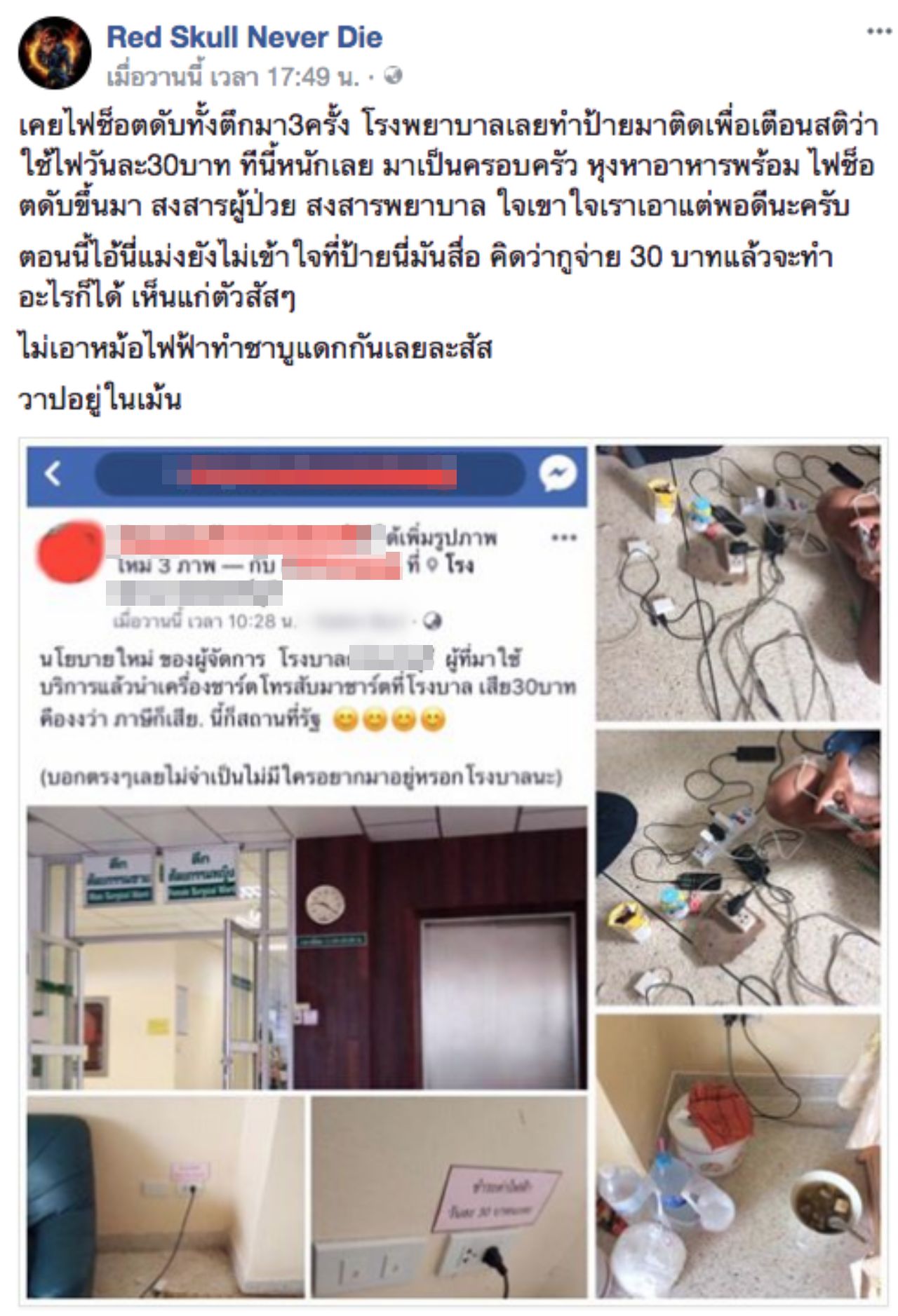 เพจเฟซบุ๊ก Red Skull Never Die ได้นำภาพจากหน้าเฟซบุ๊กของหนุ่มรายหนึ่งที่โพสต์ข้อความว่า “โรงพยาบาลเก็บค่าไฟฟ้ากับคนที่นำโทรศัพท์มาชาร์จ 30 บาท คืองงว่า ภาษีก็เสีย นี่ก็สถานที่รัฐ” พร้อมกับนำหม้อหุงข้าวและปลั๊กพ่วงมาต่อเพื่อชาร์จโทรศัพท์มือถือจำนวนหลายเครื่อง