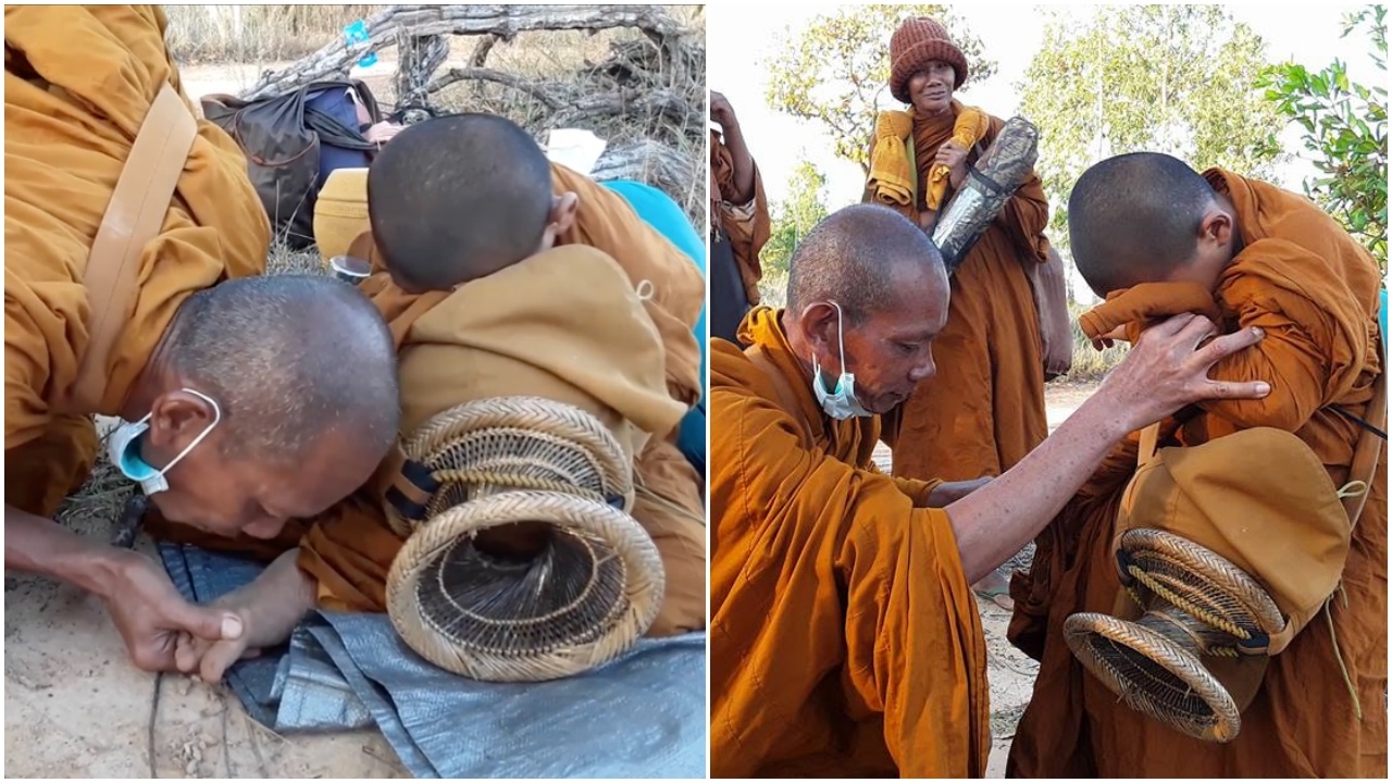 ภาพประทับใจ หลวงพ่อ เป่าเท้าปลอบ เณรน้อย ร้องไห้เพราะเจ็บเท้าจากการเดินธุดงค์ สุดท้ายยังฮึดสู้แม้จะยังไม่หายเจ็บ