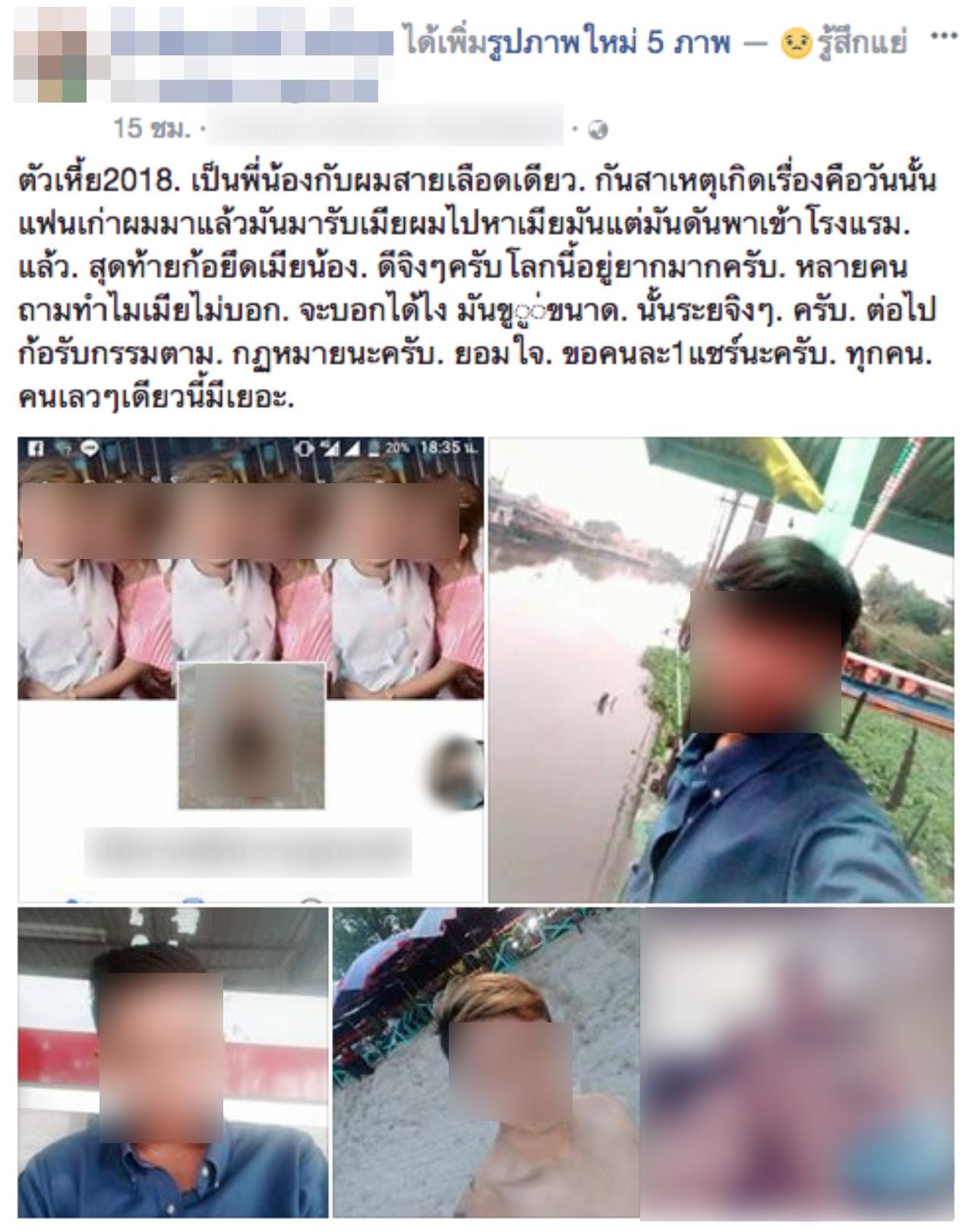 โลกออนไลน์ได้แชร์เรื่องราวจากเฟซบุ๊กของหนุ่มคนหนึ่งที่ได้อัดคลิปร้องไห้สะอึกสะอื้นว่า ถูกพี่ชายแท้ๆ แย่งเมียที่กำลังจะมีลูกด้วยกัน ทำไมทำกันได้ลงคอ ตนยังไม่เคยไปยุ่งกับผู้หญิงของพี่ชายเลย ยังมีอะไรที่แย่กว่านี้อีกไหม ไม่มีอะไรจะเสียแล้ว