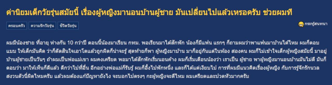 การคบหากันระหว่างวัยรุ่นหญิงชายเป็นเรื่องที่พูดยาก และเป็นเรื่องธรรมดาที่ผู้ใหญ่ยังคงเป็นห่วง ซึ่ง คุณ gigabitman ได้ตั้งกระทู้ถามชาวโซเชียลว่า น้องชาย อายุประมาณ 20 ปี อายุห่างกัน 10 ปี ได้เข้ามาเรียนที่ กทม. และได้ไปอยู่หอกับแฟนสาว ซึ่งครอบครัวฝ่ายหญิงก็ไม่ได้คัดค้าน รวมทั้งยังพากันเข้ามานอนในบ้านของตน