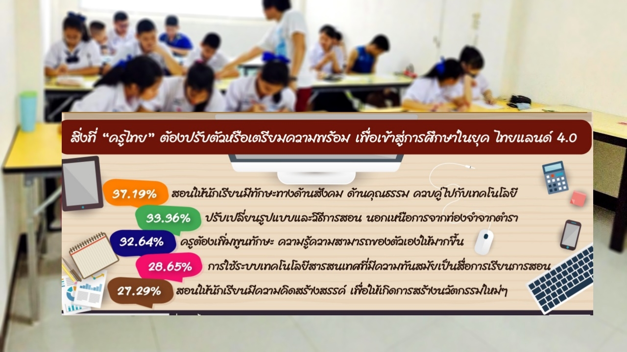 ท้ายสุด เมื่อถามถึงสิ่งที่ “ครูไทย” ต้องปรับตัวหรือเตรียมความพร้อม เพื่อเข้าสู่การศึกษาในยุคไทยแลนด์ 4.0 พบว่า ประชาชนส่วนใหญ่ ร้อยละ 37.19 ระบุว่า สอนให้นักเรียนมีทักษะทางด้านสังคม ด้านคุณธรรม ควบคู่ไปกับเทคโนโลยี รองลงมา ร้อยละ 33.36 ระบุว่า ปรับเปลี่ยนรูปแบบวิธีการเรียนการสอน นอกเหนือจากการท่องจำจากตำรา ร้อยละ 32.64 ระบุว่า ครูต้องเพิ่มพูนทักษะ ความรู้ความสามารถของตัวเองให้มากขึ้น ร้อยละ 28.65 ระบุว่า การใช้ระบบเทคโนโลยีสารสนเทศที่มีความทันสมัยเป็นสื่อการเรียนการสอน ร้อยละ 27.29 ระบุว่า สอนให้นักเรียนมีความคิดสร้างสรรค์ เพื่อให้เกิดการสร้างนวัตกรรมใหม่ๆ และร้อยละ 1.04 ไม่ระบุ/ไม่แน่ใจ.